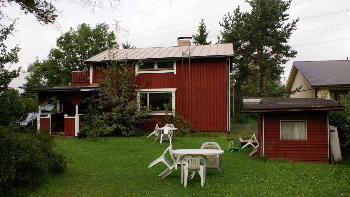 O casă din lemn cu etaj, tipic finlandeză: roşie-cărămizie de la vopseaua tradiţională ignifugă obţinută dintr-un anumit tip de argilă, cu anexe identice, dar mai mici, şi curte mare cu iarbă deasă. Lîngă pădurea şi staţia de tren din Puistola, o suburbie situată în nordul-estul capitalei finlandeze.
