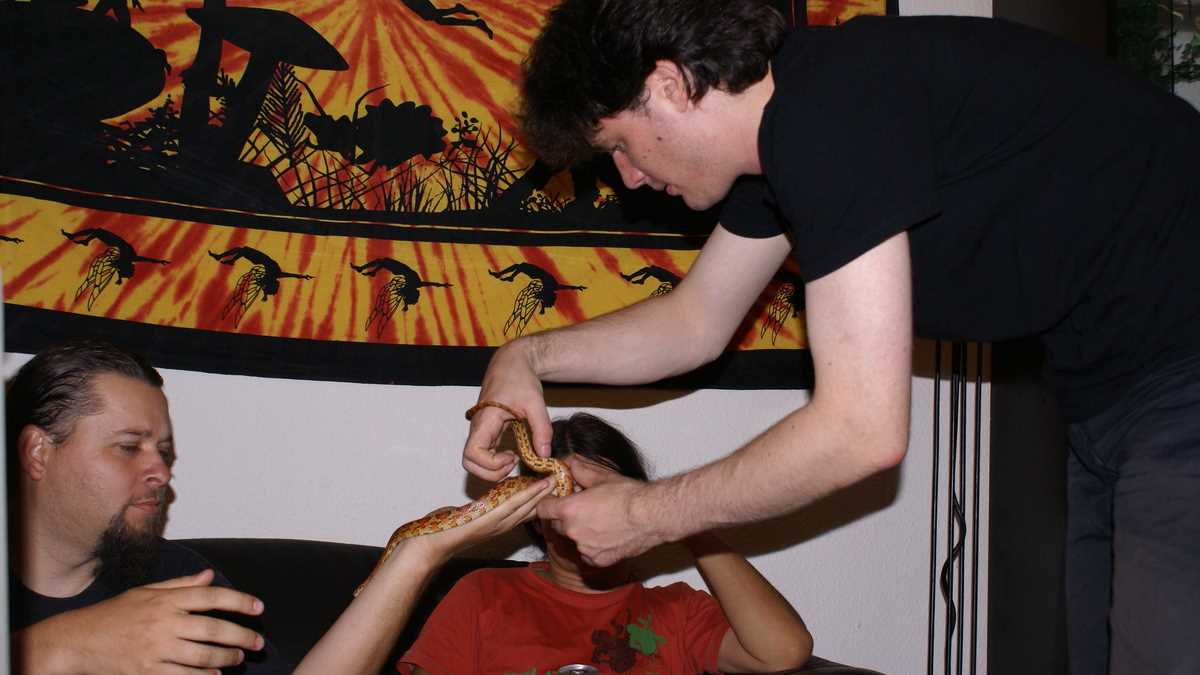 Intrăm. E vraişte, ca după explozie şi peste tot miroase a fum. De ţigară. Inclusiv în baie! Într-un colţ, un terrarium luminat, în care locatarul stă ascuns şi “probabil se bucură că va mînca şi altceva decît şoareci”, după cum ne spune stăpînul său cu un aer malefic.