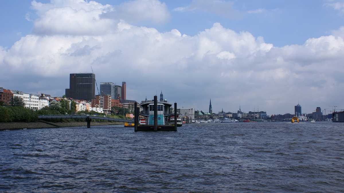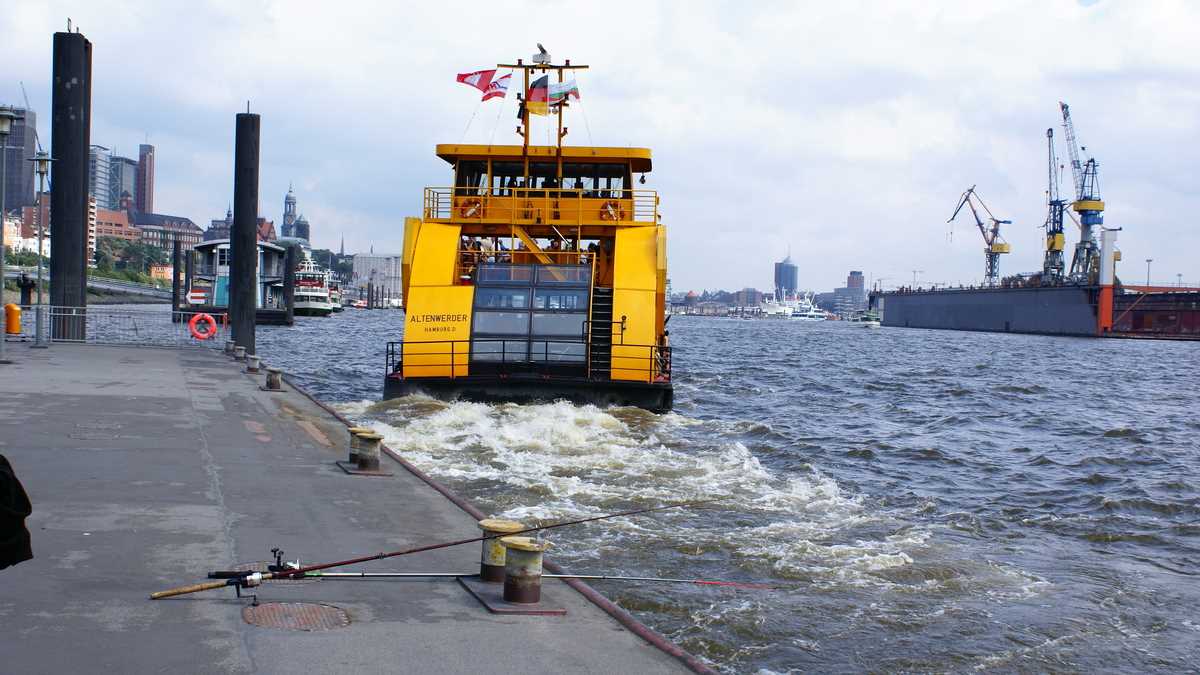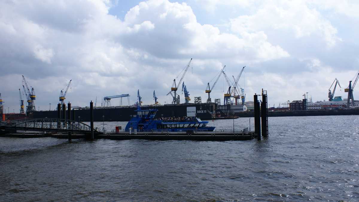 În spatele pieţei e staţia de vaporaş care te duce, împreună cu alţi turişti împrăştiaţi printre navetiştii plictisiţi (personal portuar), într-un tur al Hafen Hamburg, denumirea locală a portului. Pe faleză, din loc în loc, panouri cu fotografii sau desene vechi şi harta cu detalii istorice a zonei.