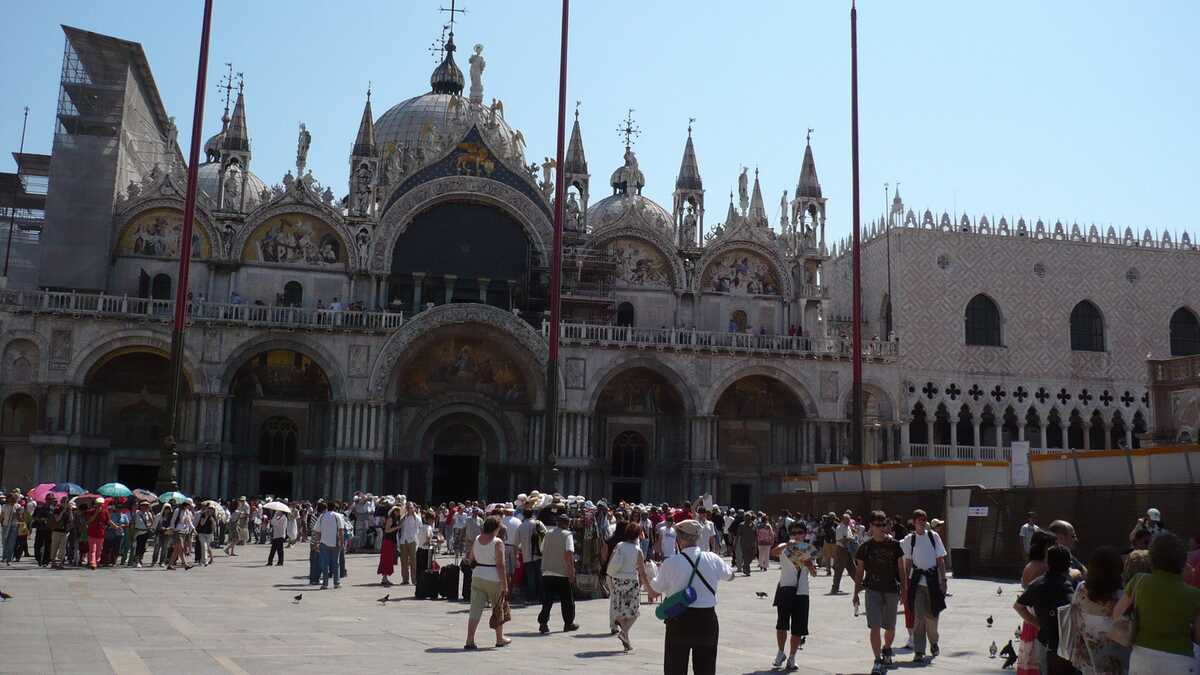 Piazza San Marco, Basilica, Palazzo Ducale. Zona e invadată de turişti; e ca într-un supermarket sîmbătă seară: te ciocneşti de ceilalţi la fiecare pas, iar cozile la case încep de la Puntea Suspinelor. Piaţa superaglomerată survolată de porumbei e mărginită de restaurante cu terasă (la care, seara, mănînci direct într-un show despre istoria Veneţiei cu imagini video, fotografii, picturi proiectate in piaţă) şi buticuri cu cristale de Murano la preţuri de automobil cu toate opţiunile incluse. O vioară, o chitară, un papagal. Chiar şi peştele de sticlă colorată de pe televizorul alb-negru al mamaiei de la ţară.