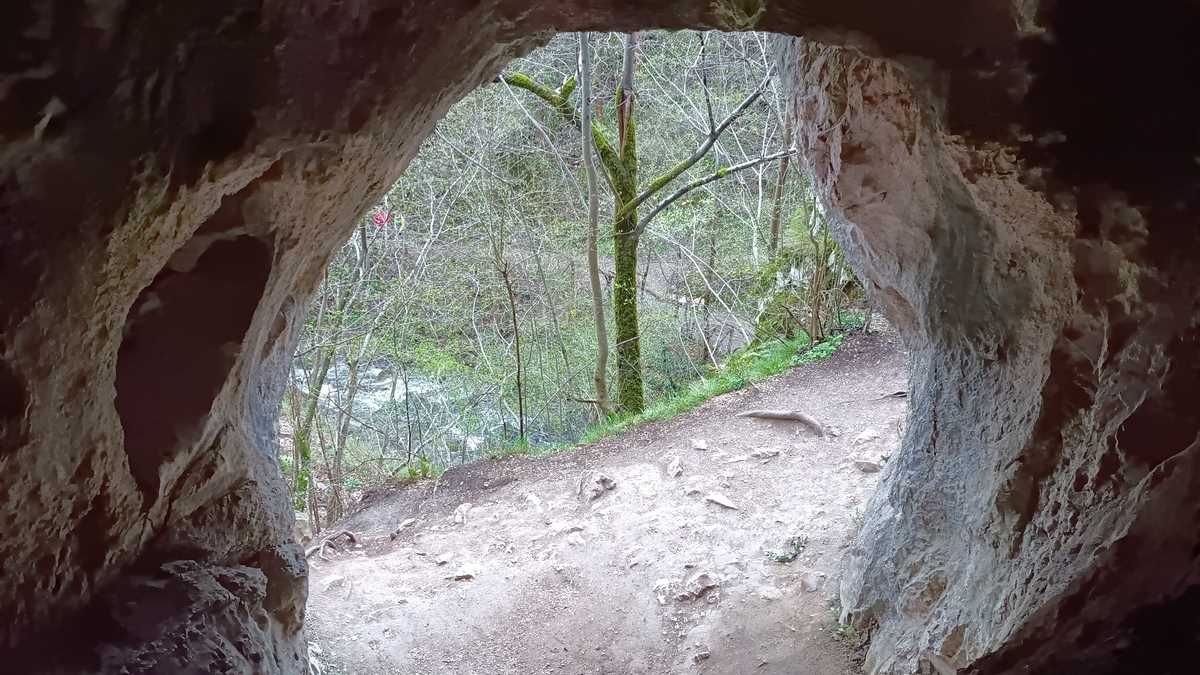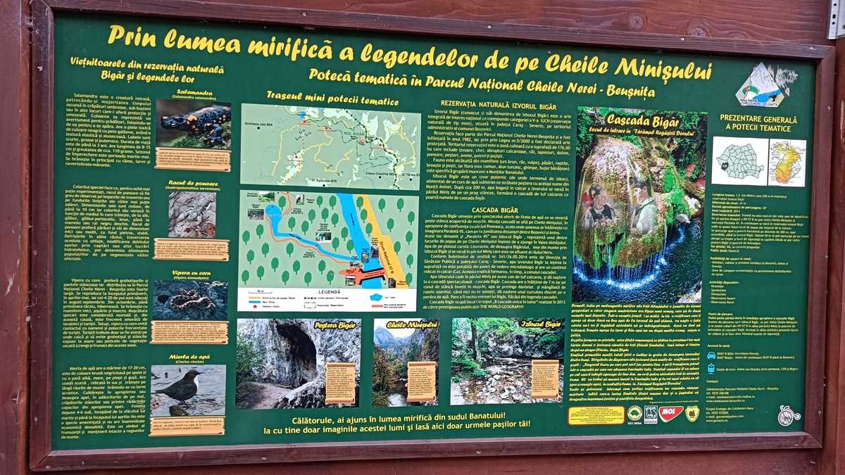 Reportînd pentru ceva mai tîrziu plăcerea de a o studia în detaliu, traversezi mai întîi podețul cu poartă din lemn peste apele Minișului și, lăsînd pe dreapta foișorul locului de popas (cu grătar, evident!) de deasupra cascadei, urci poteca prin pădure spre izbucul și peștera din amonte. După vreo cinci minute de mers liniștit, drumeagul se oprește în peretele stîncos de sub care izbucnește cursul de apă subteran transformat în pîrîul Bigăr. O punte peste apele repezi duce spre scara și bolovanii uzi cu parapet de susținere pentru urcarea și coborîrea celor cîțiva metri pînă la întunecoasa grotă verticală, avenul în care intri doar doi-trei pași pînă la marginea hăului.