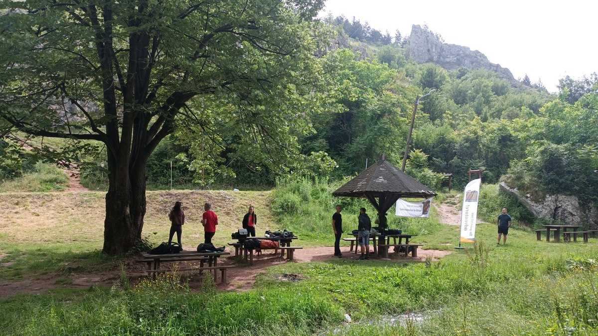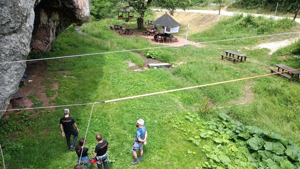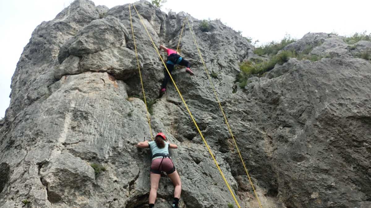 Simpaticii munțomani sîrbi au setat tabăra în zona de picnic cu foișoare și mese din lemn de lîngă un pîrîu survolat de libelule albastre, sub versantul găurit de o grotă, chiar lîngă șosea. După scurtul atelier informativ de prezentare a zonei, a echipamentului și a măsurilor de siguranță, fiecare dintre noi a primit cîte un ham și o cască, apoi s-a dat startul primei runde, cățărarea și coborîrea în rapel. Pentru asta, am traversat mai întîi asfaltul și ne-am încolonat, urcînd vreo zece minute versantul opus, pînă la zona stîncoasă unde, de pe peretele aproape vertical cu surplombă în partea superioară, au fost alese două trasee de escaladă de dificultate asemănătoare, primul un pic mai greu pe porțiunea de start, celălalt, pe cea finală.