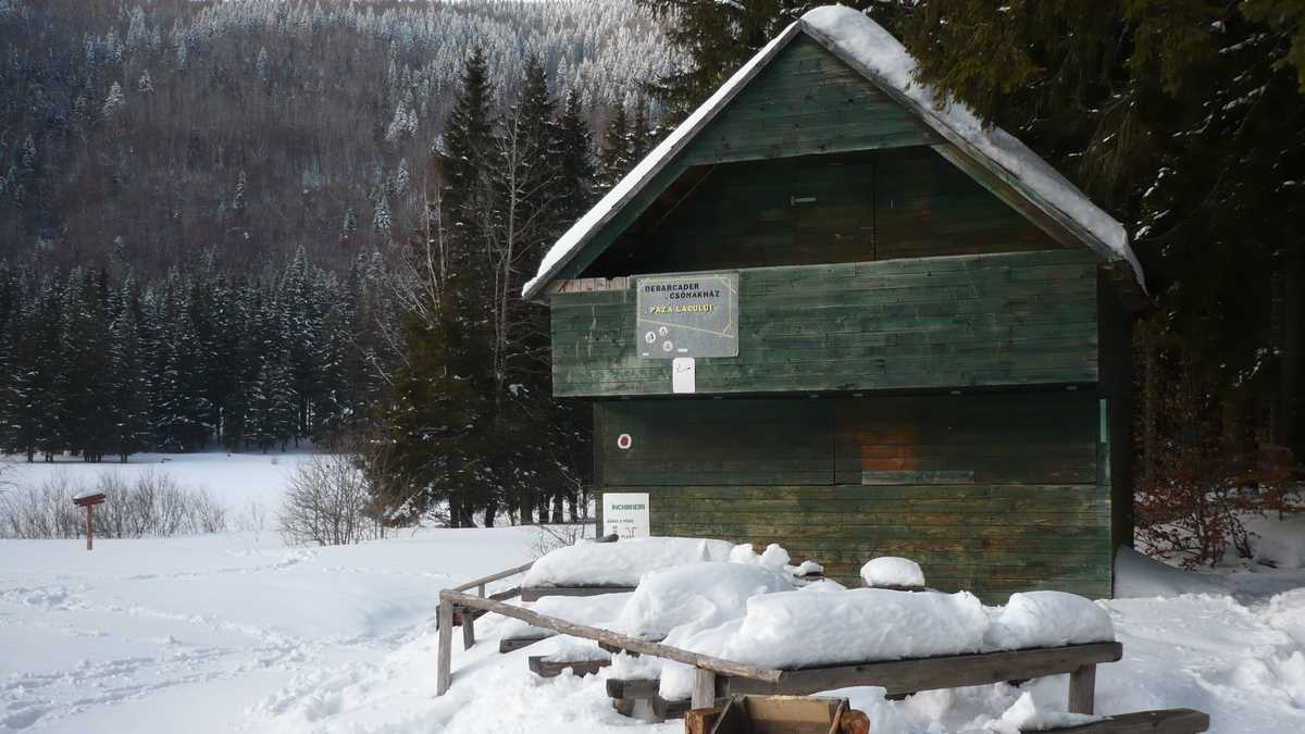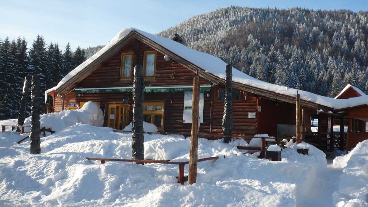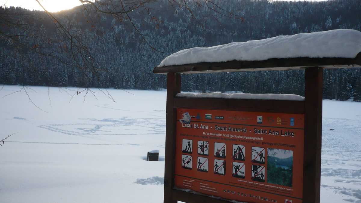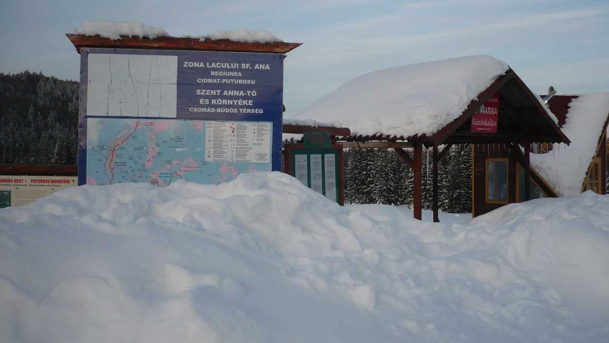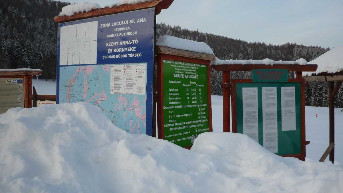 Lăsînd în urmă hărmălaia și guițăturile din parcarea centrală a stațiunii, banda bătucită cu zăpadă a DJ 113 urcă o serie de serpentine prin pădure, trece pe lîngă Grand Hotel Buda…, pardon, Balvanyos, un stabiliment de 4 stele construit într-o pustietate în care ajunge mai des ursul decît omul (de remarcat că, informație foarte utilă, la hotelul ăsta se află singurul bancomat din zonă – nu știi niciodată cînd rămîi fără cash în locurile izolate, unde plata cu cardul e ficțiune financiară), și, 10-12 km mai tîrziu, se oprește în parcarea (10 lei) cabanei-motel Lacul Sf. Ana (care, mai nou, are circuit închis și foarte închis).