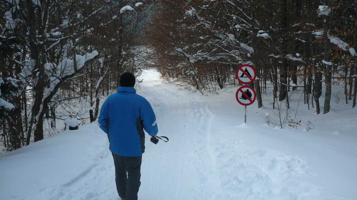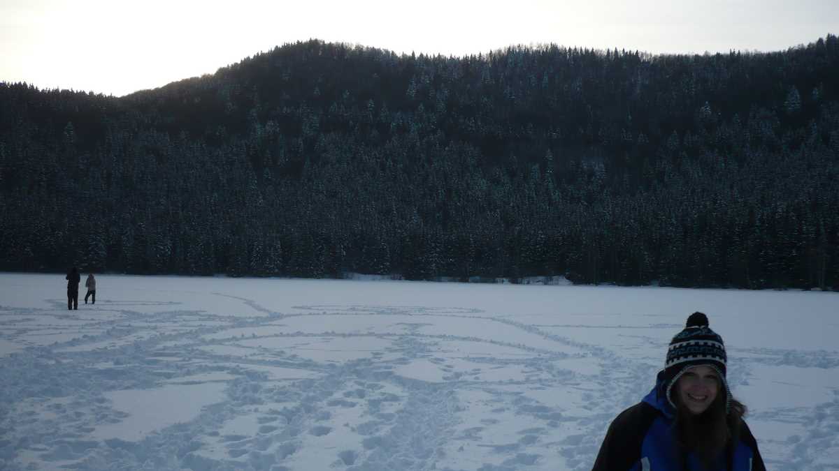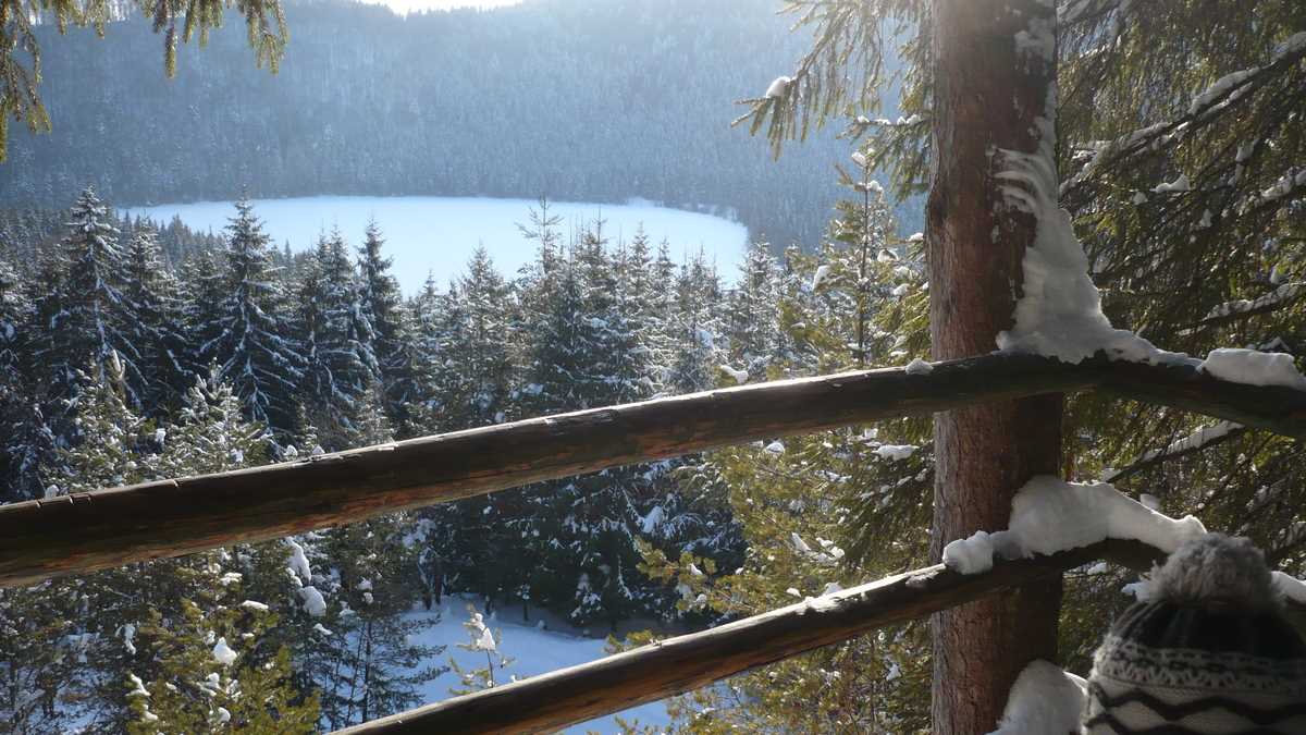 Prea multe nici nu sînt de văzut, de fapt: craterul fostului vulcan care, vara, este acoperit cu oglinda apei e acum un imens patinoar înzăpezit pe care nu-i recomandat să te aventurezi, dacă vremea dă semne de încălzire (nu cred că-ți dorești, în februarie, să faci scuba diving în lacul adînc de șapte metri). Cine a luat-o pe scurtătura din pădure, îndrumat de panoul indicator „Spre punctul de belvedere”, va avea și o imagine de ansamblu, printre brazi ninși, de pe platforma din lemn cu vedere directă la calota glaciară a lacului. Dacă nu e ceață.