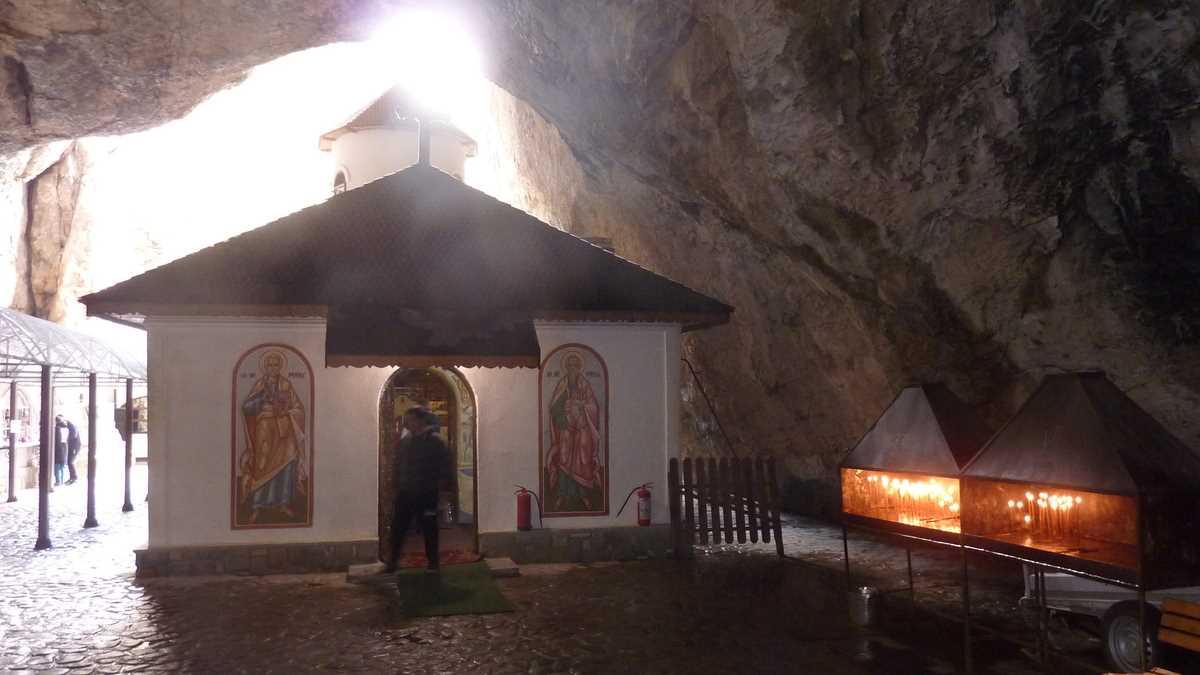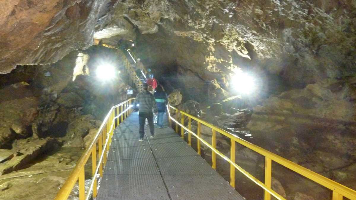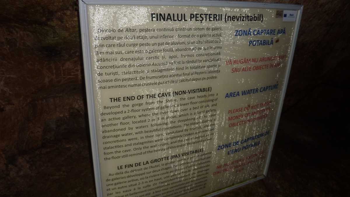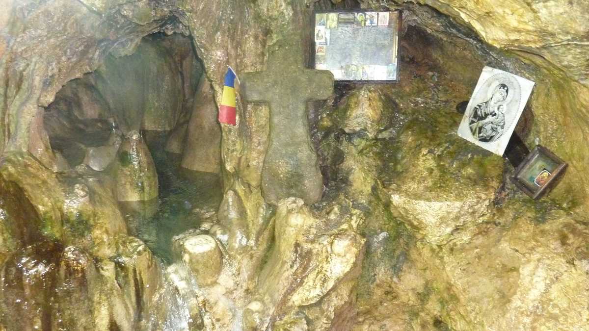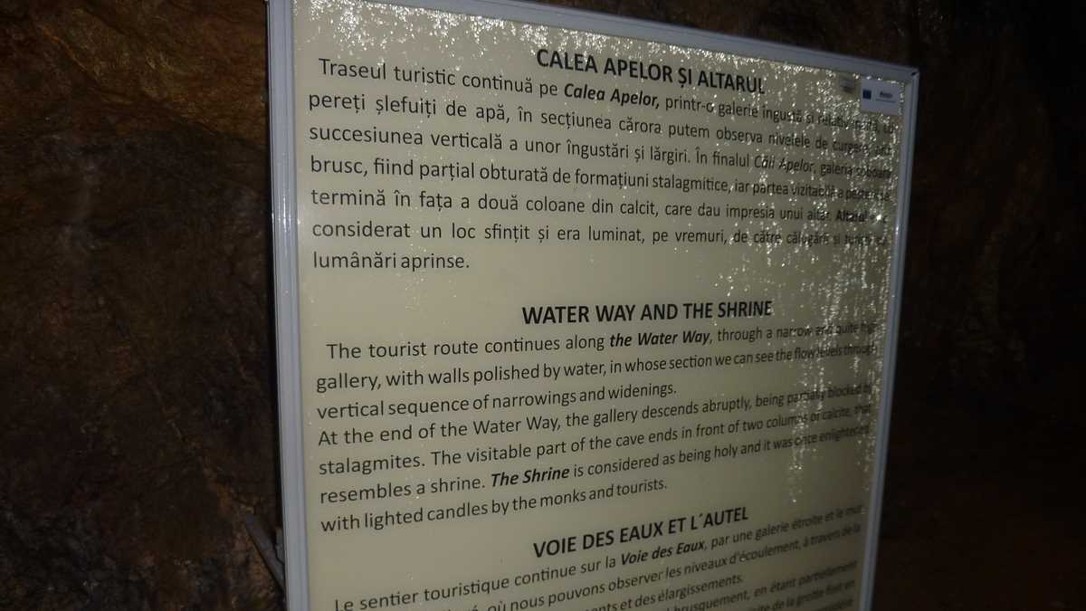 Prima constatare, pentru cine n-a mai fost într-o peșteră, e că-i rece și foarte umedă, cu zone în care plouă permanent prin roca poroasă, permeabilă, cam prin toate galeriile și sălile. Mai puțin în prima, Grota Mihnea Vodă, care păstrează dimensiunile portalului de intrare (aproximativ 20 de metri înălțime și 40 de metri lățime) pe o porțiune de vreo sută și ceva de metri, din care se face trecerea prin Pasaj spre Bolta lui Decebal, unde te întîlnești, sub puntea metalică, cu șuvoaiele pîrîului subteran. La Răspîntie, calea de acces se bifurcă: o ramură coboară la Lacuri și la cascadă, o cădere rapidă de apă de la vreo trei-patru metri, alta urcă în stînga, spre Sala Urșilor sau Sala Mare, zona în care s-au descoperit scheletele de urs al cavernelor mutate la muzeu și unde-a mai rămas doar replica unui craniu de Ursus Spelaeus, într-o casetă de plexiglas. De aici, prin Calea Apelor, o galerie îngustă și întortocheată, se ajunge la capătul vizitabil al peșterii, La Altar, locul sfințit de o cruce din piatră, o icoană și un steguleț tricolor, care, pe vremuri, era scos din beznă doar de lumînările aprinse de călugări. Nu se mai poate trece, azi, în Galeria Ascunsă, vandalizată de turiștii trecutului, care i-au smuls stalactitele și stalagmitele, ca să plece de-aici cu un suvenir pentru peștera de acasă. Nici cei ai prezentului nu-s mai cuminți: profitînd de absența personalului administrativ și de neglijența părinților, copiii și adolescenții umblă brambura, de bezmetici, nesupravegheați, prin peisaj, producînd ambuteiaje în trafic, mai ales pe segmentele înguste și în culoarele joase prin care abia trece o persoană, acolo unde trebuie acordată prioritate celor care vin din sens opus, mai ales persoanelor în vîrstă sau celor care abia aici realizează că suferă de claustrofobie.