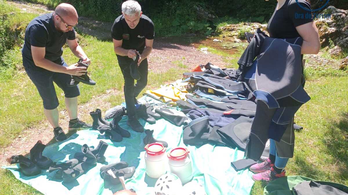 Nu poți intra oricum într-o peșteră care nu-i amenajată pentru vizitare cu eșafodaj de schele, trepte, balustrade, sistem de iluminare. Samar n-are nimic din toate astea: e imperios necesară, deci, purtarea unui echipament adecvat – costum din neopren, șosete speciale, cizme din cauciuc cu talpa striată, cască, lanternă frontală. Ghizii au, la purtător, în plus față de dotarea standard, bidoane de plastic închise etanș și saci impermeabili în care cară corzi, lanterne și baterii de rezervă, snacks-uri și batoane energizante, apă. Pregătirea asta s-a făcut lîngă un pîrîiaș care curge printre niște stînci abrupte, la un adăpost fără pereți, dar cu acoperiș, masă și două bănci, loc de gustare, odihnă sau, în cazul nostru, de echipare și instructaj: Toate fermoarele echipamentului închise pînă la capăt, Atenție pe unde calci și pe unde dai cu capul/casca, Ascultă indicațiile ghizilor, Stai în grup compact, Fă poze doar din poziția oprit pe teren ferm. Kathi, nemțoaica, ne-a mărturisit că suferă de claustrofobie și că n-ar prea vrea să intre, dar am convins-o să-și învingă frica de spații închise și să încerce.