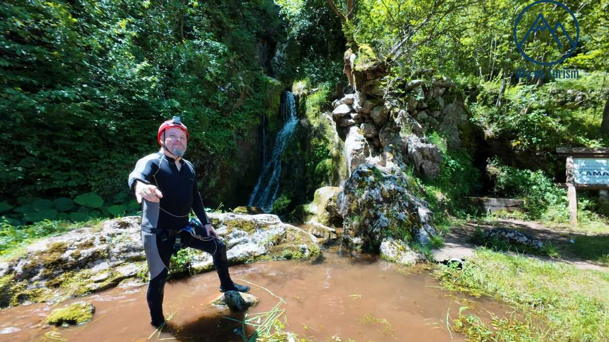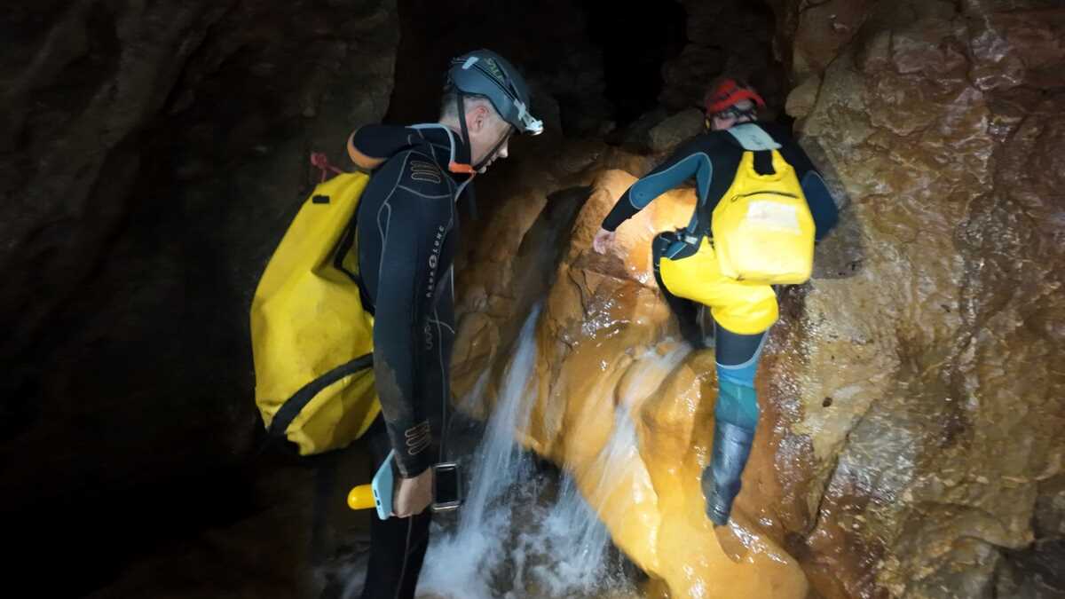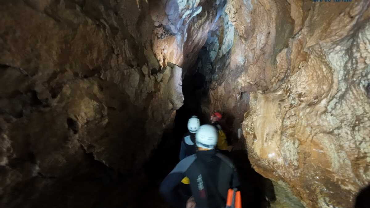Intrarea e undeva un pic mai sus de locul de popas, o gaură între bolovani prin care te strecori sprijinit în mîini pînă la primii pași ai celor trei kilometri de galerie printr-o rocă, din fericire, nealunecoasă, pe care am avansat, urcînd sau coborînd, cu precauție, în cam toate pozițiile: și biped, dar și în mersul piticului, în patru labe, tîrîș, prin culoare strîmte sau prin matca unui pîrîu subteran cu praguri de piatră pe care curg minicascade, pe prundiș și bolovăniș, prin nămol și apă pînă la genunchi, la brîu, la piept sau chiar înot, stil pluta, pe spate. La o temperatură a aerului constantă, de vreo 11-12° C, și a apei foarte rece, doar cîteva grade peste zero, costumul din neopren și-a dovedit utilitatea: dacă e mărimea potrivită pentru tine, stă fix pe piele și izolează termic foarte bine, păstrînd temperatura corpului la valori confortabile.