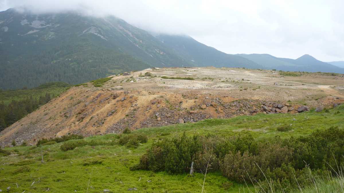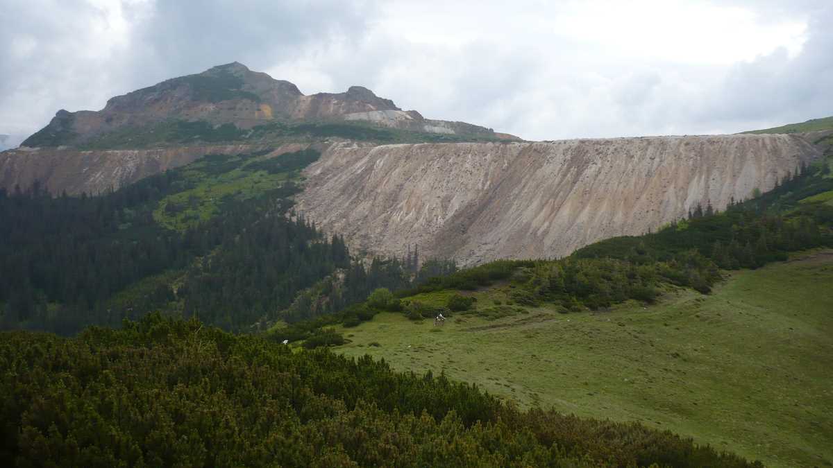 A doua zi dimineață. Pînă pe Pietrosul mai sînt trei ore de bandă roșie, pe traseul de creastă de pe marginea căldării vulcanice în al cărei epicentru zace cadavrul fostei cariere de sulf. Exploatarea, închisă în 1997, a abandonat un munte sfîșiat, tranșat-terasat în hălci roșiatice; privim peisajul ăsta sinistru de pe halda de steril, un platou sterp înconjurat de o vegetație superpitică, probabil extraterestră, pe care adepții teoriei conspirației ar putea filma o reconstituire a celebrei asolizări pe Lună, din ’69, destul de credibilă. În paranteză fie spus, ceea ce se vede acum e rezultatul a 30 de ani de exploatare minieră de suprafață, cei zece milioane de euro cheltuiți în patru ani (2008-2012) pentru ecologizarea zonei nereușind s-o cosmetizeze nici măcar ca pe o damă de vîrsta a treia, care-și unește cu fond de ten ridurile de pe față. Pentru un eventual preview al Roșiei Montane 2044, veniți aici.