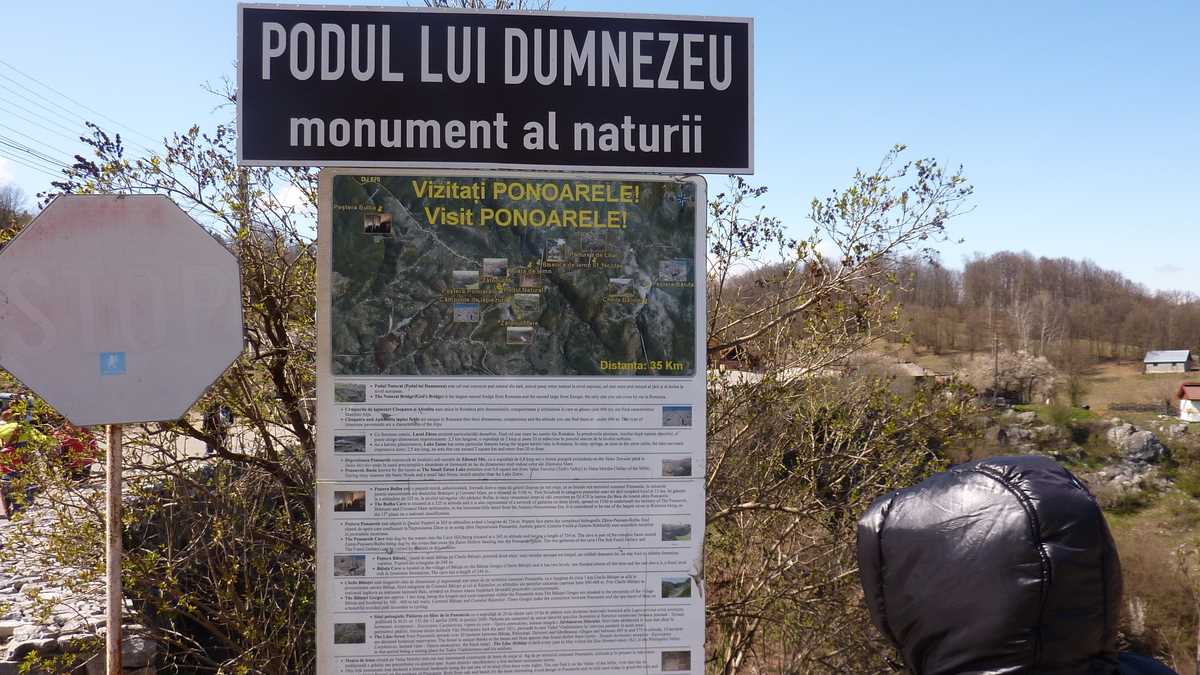 Drumul cel mai scurt de la Baia de Aramă la Drobeta-Turnu Severin (DJ 670, pe numele lui de scenă ca asfalt oficial) trece peste podul de piatră de la Ponoarele, județul Mehedinți, singurul pasaj rutier natural încă funcțional din România și, cică, unul dintre foarte puținele din lume. Sună interesant, nu? Raritatea asta botezată Podul lui Dumnezeu merită, deci, dacă tot ajungi prin zonă, un scurt popas de studiat mai de aproape minunea arhitectonică care, repetată prin toată țara, ne-ar asigura infrastructura rutieră de care e atîta nevoie (la cîte cruci și referiri evlavioase la Domnu’ facem, zilnic, e de mirare că n-o avem încă). 30 de metri lungime, 13 metri lățime, 22 de metri înălțime și 9 metri grosime, structură masivă de calcare stratificate în bancuri de unu-doi metri, cam ăștia ar fi parametrii tehnici din planul constructorului pentru bucata din Peștera Podului alăturată, rămasă afară după separarea prin surparea unei porțiuni din plafonul vechii galerii.