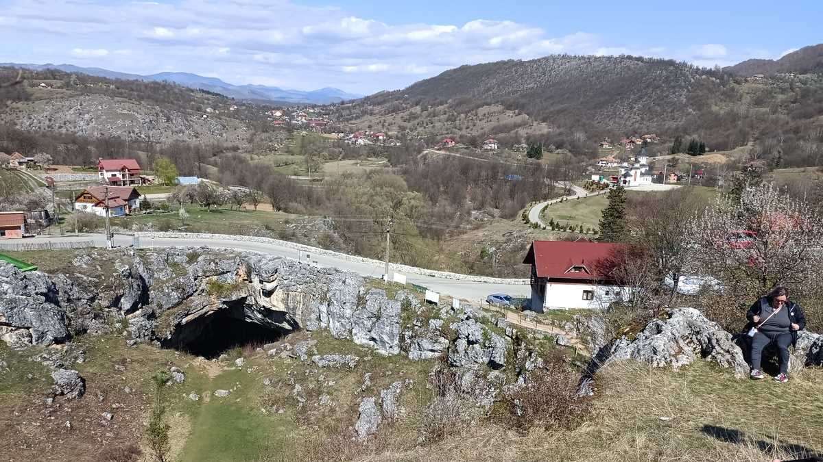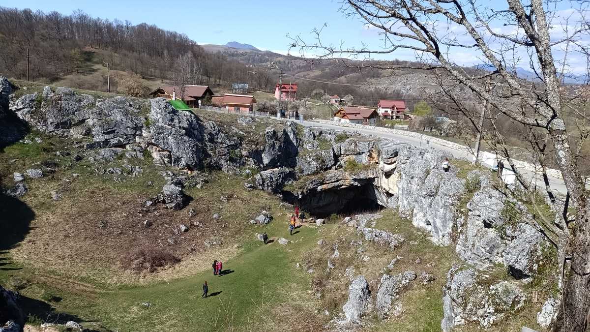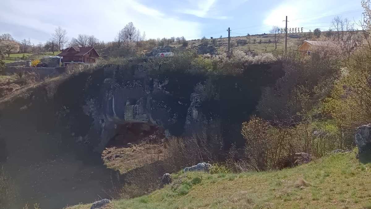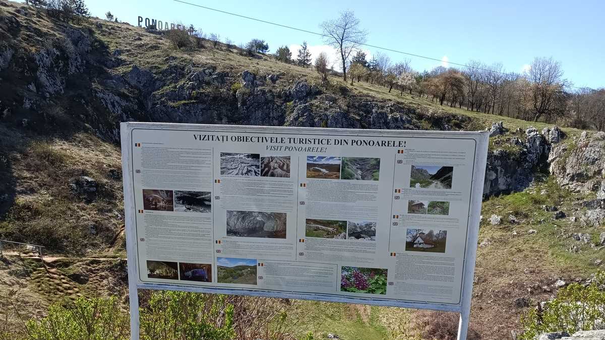 Primul lucru pe care îl remarci după ce-ai ieșit din mașină e că, deși divinitatea a făcut toată treaba, au contribuit și oamenii cu ceva la proiectul ăsta: parcarea largă, indicatoarele, panourile informative, treptele cu balustradă, numele localității postat cu litere mari, iluminate nocturn, ca la Hollywood, pe creasta Dealului Peșterii arată că cineva cu putere de decizie în administrația locală și-a dat seama că natura spectaculoasă a reliefului carstic de la Ponoarele cere dotări de obiectiv turistic. Pentru că apa a mai săpat și alte forme geologice în afara Podului lui Dumnezeu, pe care le poți vedea cel mai bine urcînd din șosea, în cam zece minute, costișa de deasupra peșterii pînă pe culme. Din punctul de belvedere de lîngă literele uriașe vopsite tricolor se deschide perspectiva unui peisaj plăcut ochiului. Pe partea asta, de unde-ai urcat, jos, satul cu căsuțele sale răsfirate; în depărtare, vîrfurile încă înzăpezite ale Masivului Godeanu. Dincolo, peste culme, sub cîmpurile de lapiezuri Cleopatra și Afrodita, albia lacului Zaton – în aprilie, aproape secat. Un tablou cu eroziuni create prin șiroirea apei pe calcare, niște șanțuri adînci care șerpuiesc printre stînci, cele mai mari dintre acestea ajungînd la lungimi de patru-cinci metri. Apropo de șerpuire: mare atenție la pietrele pe care se bronzează la soare, încălzindu-și sîngele rece, viperele, care ating la maturitate lungimi mai mici, dar mult mai periculoase.
