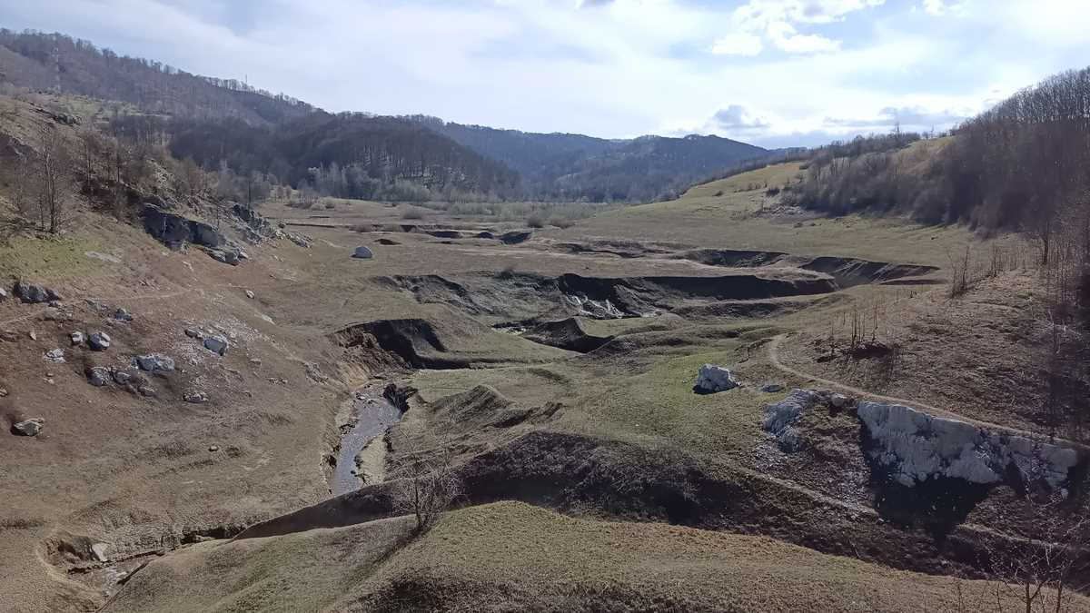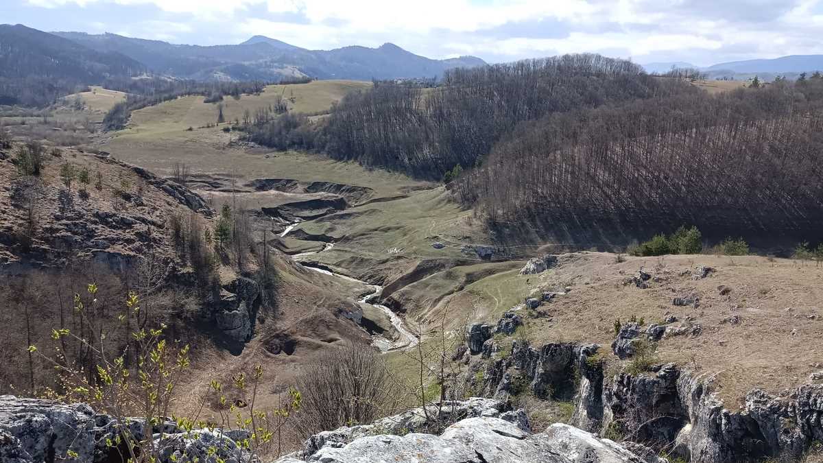 Dacă stai bine pe picioarele încălțate cu bocanci poți coborî spre Zătonul Mare, lacul carstic care, în primăverile ploioase, imediat după topirea zăpezilor, se umflă pînă la dimensiuni de lac de baraj (2,5 kilometri lungime și peste 20 de metri adîncime); în restul timpului, nealimentat, e doar o baltă ceva mai mare, la capătul cursului de apă de pe fundul văii care dispare în pămînt, printre tufe de vegetație, traversînd rocile permeabile către peștera și Podul lui Dumnezeu de pe partea cealaltă a versantului. Imaginează-ți o pîlnie imensă îngropată pe orizontală în masivul carstic, cu peretele superior parțial prăbușit între peșteră și arcada punții divine, în care apa curge invers față de lichidul turnat în sticlă, de la vîrf către gură.