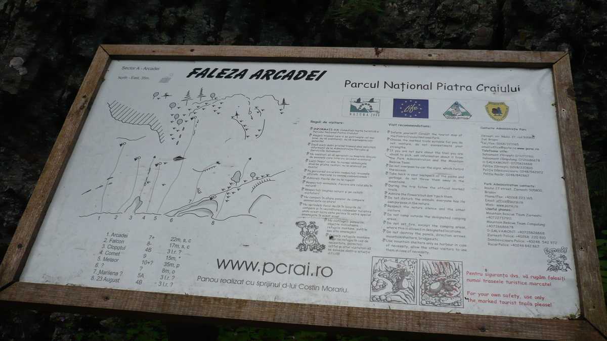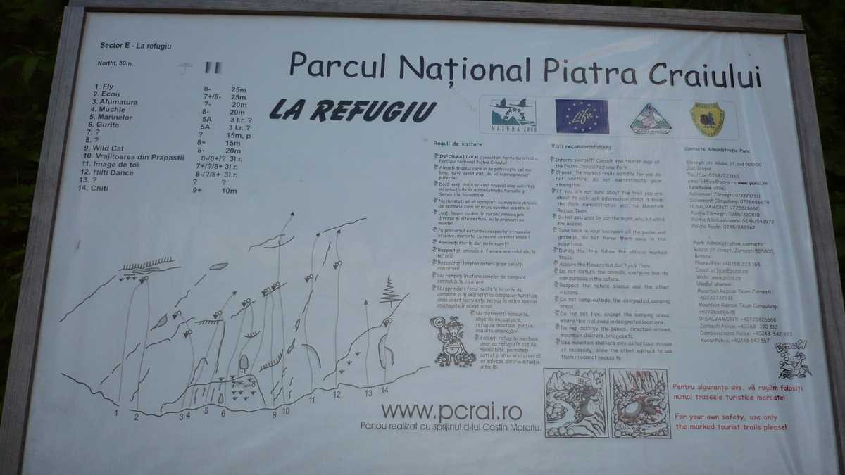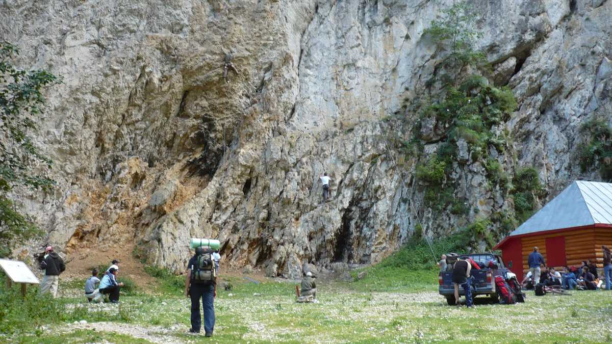 Dacă te-ai săturat de atîta mers și singurul lucru care-ți vine în minte e o bere rece, faci dreapta și o ții întins spre Gura Rîului, cabana-motel de la marginea Zărneștiului; dacă încă te mai țin picioarele și ai chef de o vizită în Prăpăstii, o iei în stînga și treci de bariera care (se presupune că) blochează accesul tuturor mașinilor în defileul cu versanți împăduriți al Rîului Zărneștilor, creat în ‘jde mii de ani chiar de (îți vine să crezi sau nu) pîrîiașul cu curs firav, pe alocuri inexistent, care însoțește traseul. Chiar la intrarea în chei, pe stînga, suspendată în perete, la vreo zece metri elevație față de drum – la etajul 4, cum ar veni –, se cască fereastra (acum închisă cu un grilaj metalic) Peșterii Mari de la Prepeleac, grota care are o oarecare faimă printre speologii pasionați și de artropode: aici s-a descoperit pentru prima dată păianjenul Nesticus Constantinescui. Se pare că arahnidul ăsta autohton a mușcat foarte multă lume pentru că, ceva mai încolo, după ce versanții pierd mult din vegetație și se îndepărtează unul de altul, zona e înțesată de Oameni-Păianjen. Agățați în coardă pe traseele de escaladă înșirate pe pereții stîncoși plini de fisuri și surplombe (care, pe unele porțiuni, au și două sute de metri înălțime), în sectoarele de cățărare dintre Faleza Arcadei și La Refugiu, un loc ceva mai larg în care se adună alpiniștii ca să-și împărtășească impresii. La filmul ăsta de aventuri există chiar și public: pe lîngă panourile informative de la marginea drumului, pantofarii cazați la pensiunile din Bran-Moeciu ieșiți la o plimbare în natură cască gura la Spiderman–i și le chibițează joaca. Poți găsi, însă, oricînd un sector mai puțin circulat pe care să-ți încerci abilitățile de cățărător, fără spectatori. Totul e să ai echipamentul și ouăle necesare.