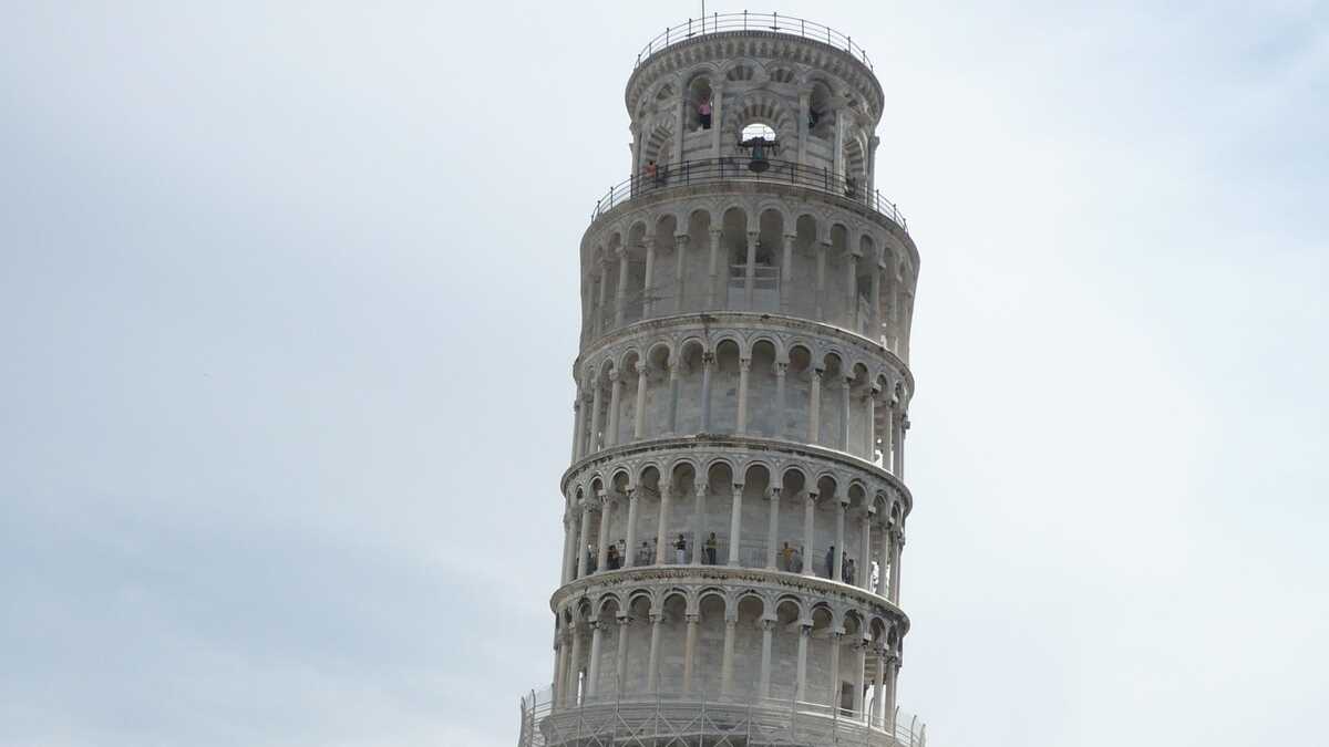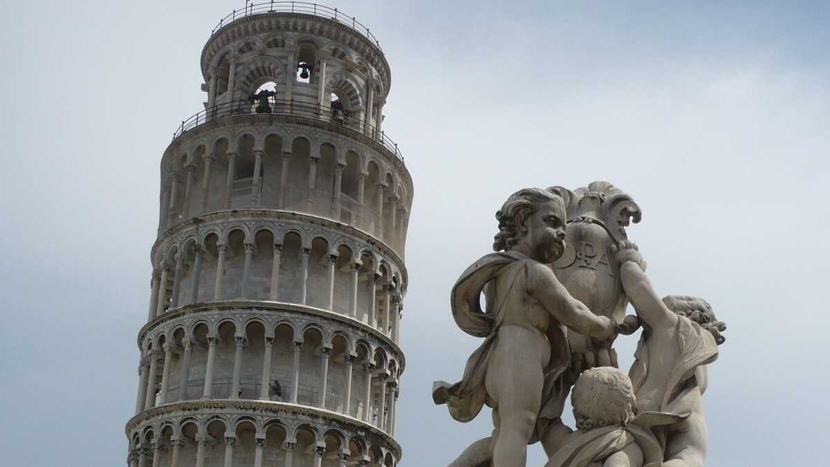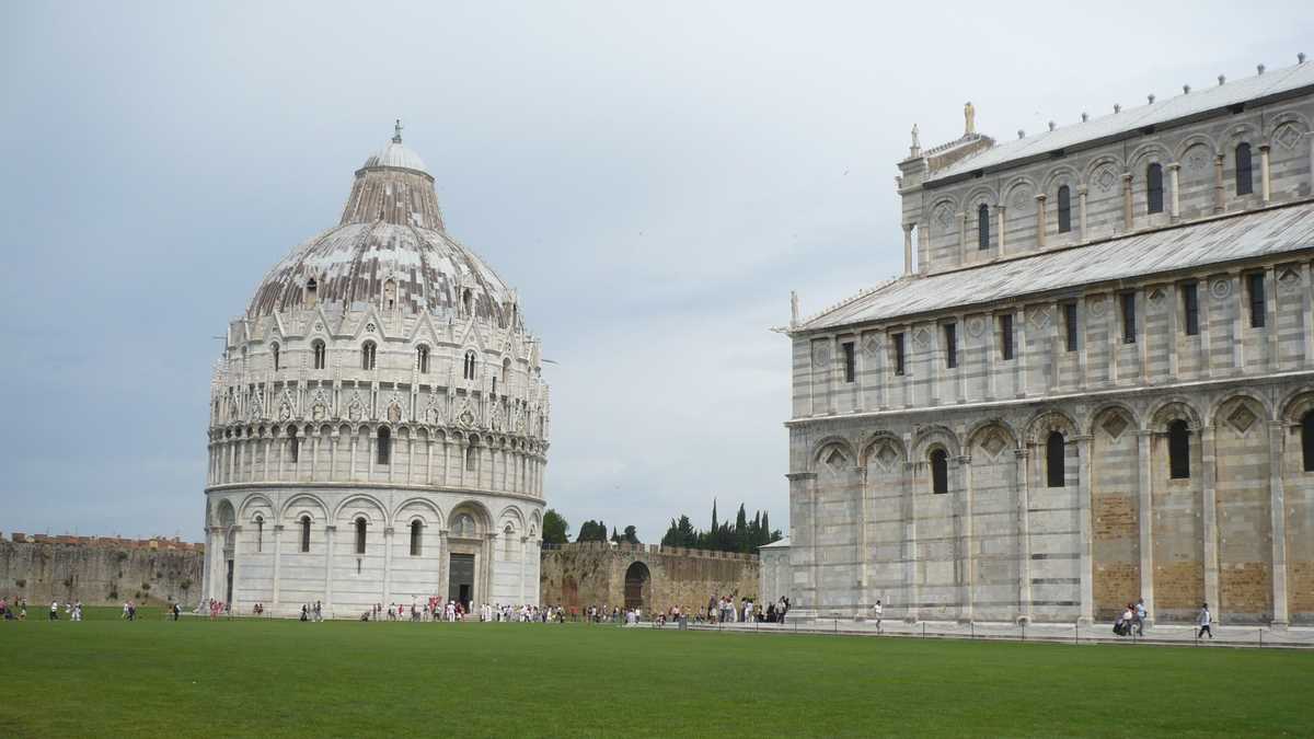 Dar s-o luăm de la un capăt: mai exact de la cel al turului pedestru început în sud, la Pisa Centrale, gara în care ai coborît, acum vreo zece minute, din trenul Genova-Florența. Pisa poate fi traversată cu pas iute în aproximativ 45 de minute, așa că, după ce treci Ponte Solferino, unul dintre cele cinci poduri peste Arno, ajungi rapid în Piazza dei Miracoli, acolo unde Torre Pendente, faimosul turn înclinat, inițial clopotniță de biserică, ia fața tuturor celorlalte clădiri care mărginesc piața (Baptisteriul, Catedrala, Museo dell’Opera del Duomo, Museo dell Sinopie). Care piață nu e, ca prin alte locuri, o suprafață pavată, ci un spațiu verde cam cît un teren de fotbal, pe gazonul căruia o mulțime de turiști în poze de status sprijină turnul faultat, să nu cadă. Cele șapte etaje (142 de metri) din marmură au fost puse unele peste altele în trei etape, între 1173 și 1370, dar abia recent, în anii 2000, le-a fost oprită definitiv propensiunea de întoarcere la orizontală. Ca să-l urci, pregătește 15 €. Și răbdare cît pentru o coadă de hipermarket în ajun de Crăciun.