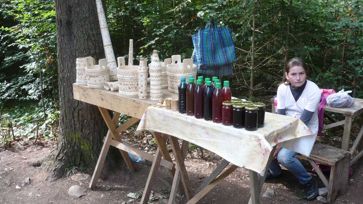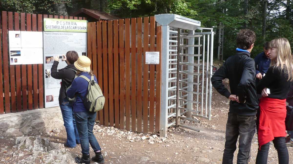 2) Ții cărarea care urcă lin vreo cîteva sute de metri prin pădure pînă la baraca unde ghidul vinde, pe lîngă tichetele de acces (10 lei), și diverse suveniruri, de la magneței de frigider și hărți ale zonei la ciubere și butoiașe din lemn.