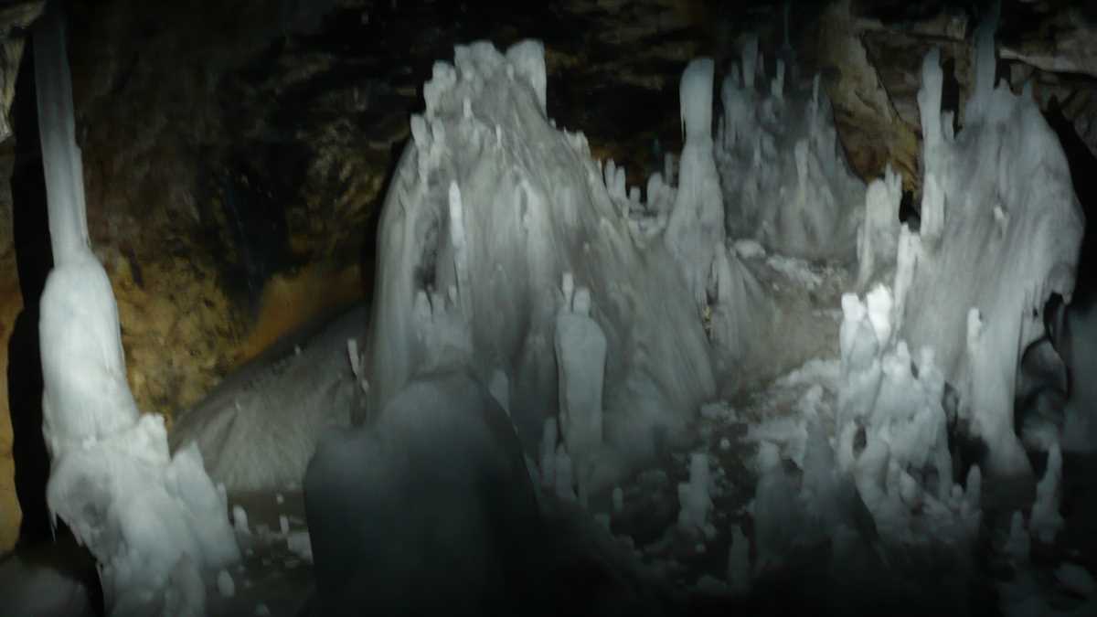 4) Intri, printr-un imens portal, într-o lume înghețată. Sala Mare. Blocul de gheață e pardoseala unei expoziții în care apa scursă-înghețată-topită sculptează neîncetat forme unice. În capăt, sub nivelul Sălii Mari, în Biserică, stalagmitele de gheață formează o adunare de enoriași tăcuți.
