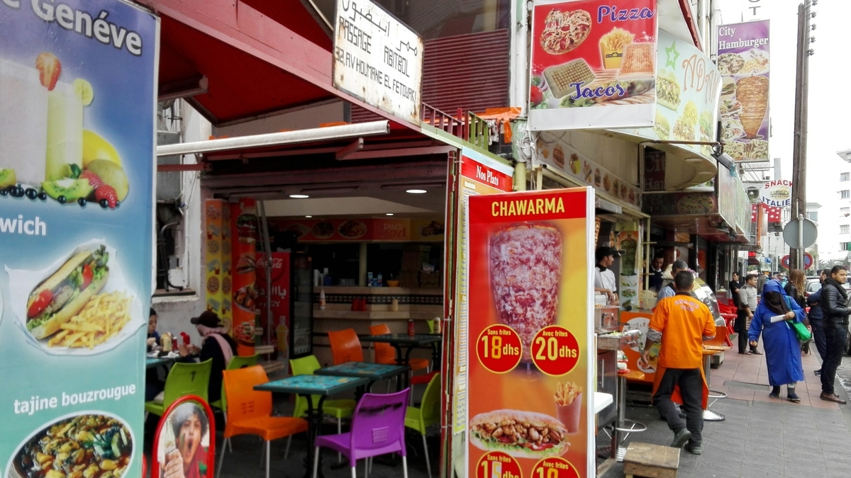 Dezvoltînd un pic spectrul culinar al meselor mele acolo, în peregrinările solo de la Rabat la Casablanca și înapoi la Marrakesh, pentru avionul retur, pe lîngă breakfast-urile de hostel aproape inexistente deja menționate, am mîncat doar produse ambalate, cumpărate din supermarket. N-am avut curaj să testez pizza, sendvișurile sau șaormele fast-food-urilor stradale: stomacul europeanului nu-i niciodată pregătit pentru diversitatea și virulența bacteriilor africane. Eram avertizat: niște prieteni întorși din Maroc fix înainte de plecarea mea acolo stătuseră vreo zi numai prin toalete, după un singur suc de rodii, stors în fața lor și băut la o tarabă. În restaurantele în care-am intrat cu colegii, deși mîncarea a fost cam aceeași – ubicuul tajine ca fel de bază –, măcar atmosfera s-a schimbat de fiecare dată. De la senzația că mănînci într-o moschee (Al Fassia din Fez), într-un muzeu (Palais Dar Soukkar, Marrakesh) sau pe stadion (la Chez Ali, situat în deșert, kilometri buni în afara Marrakesh-ului, în niște corturi berbere amplasate pe coronamentul unei arene sportive pe care s-a desfășurat ulterior un spectacol ecvestru), au putut fi experimentate tot soiul de ambianțe locale, de la cea de caravanserai de beduini, în care mai important decîtmîncarea e ritualul ceaiului turnat în pahare de la mare înălțime, la cea de palat de calif din basmele arabe.