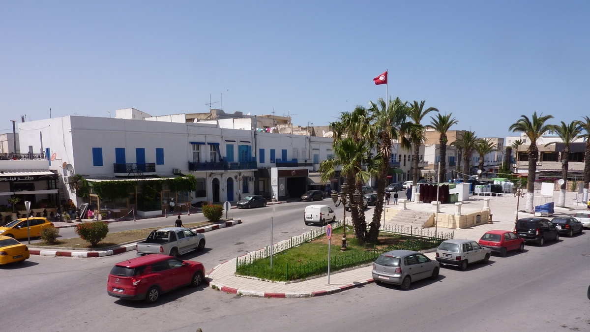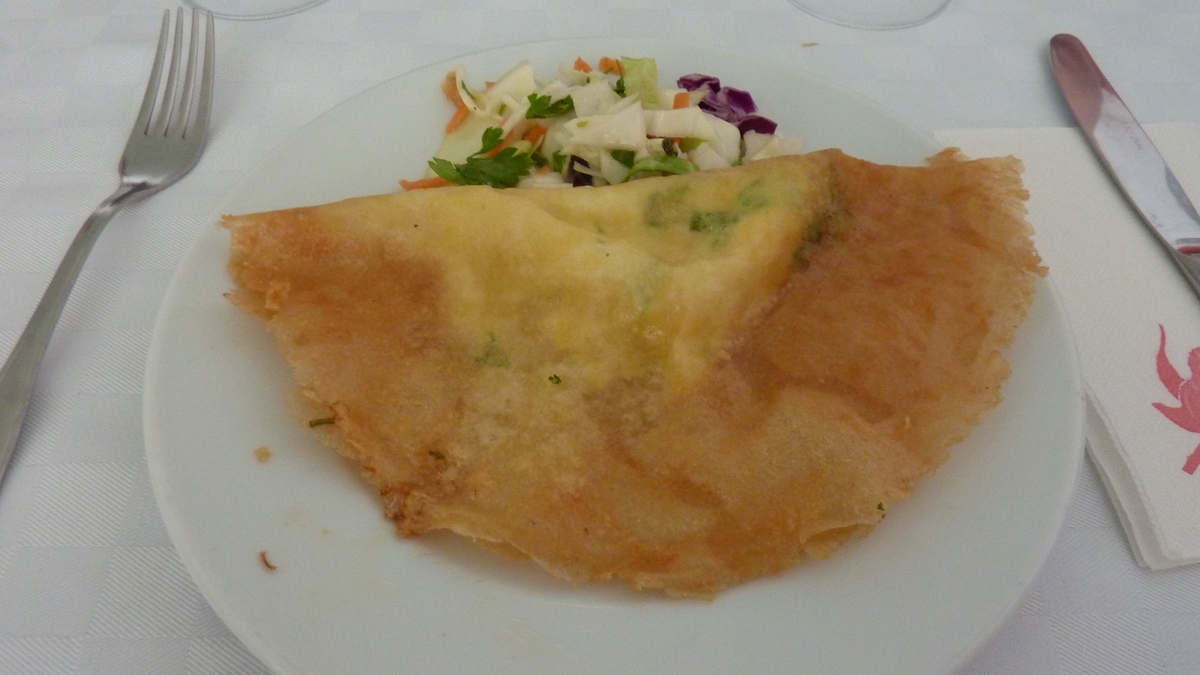 În deplasarea de o zi la Cartagina și Sidi Bou Saïd, ora prînzului ne-a găsit la restaurantul La Victoire din La Goulette, o suburbie a Tunisului. În clădirea cu copertină alb-verde în față, deasupra meselor de pe trotuarul bulevardului Avenue Franklin Roosvelt (cum scrie pe plăcuța bilingvă, în arabă și în franco-engleza al cărei proces de traducere a pierdut primul e): în salonul principal de la etaj, de la ale cărui ferestre mari, larg deschise, poți admira panorama intersecției cu sens giratoriu, palmieri și drapele naționale, în scuar. Aici ni s-au servit, la gustare, brik, o specialitate tunisiană care seamănă cu un colţunaş ceva mai mare, prăjit în ulei și umplut cu cartofi şi ou, iar la felul principal, un pilaf înecat în ulei de măsline, asezonat cu legume fierte și cîteva bucățele de pui fript.