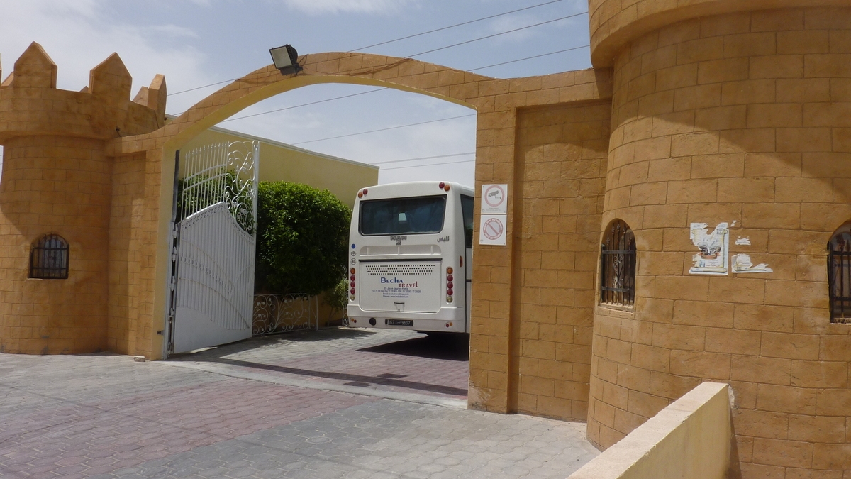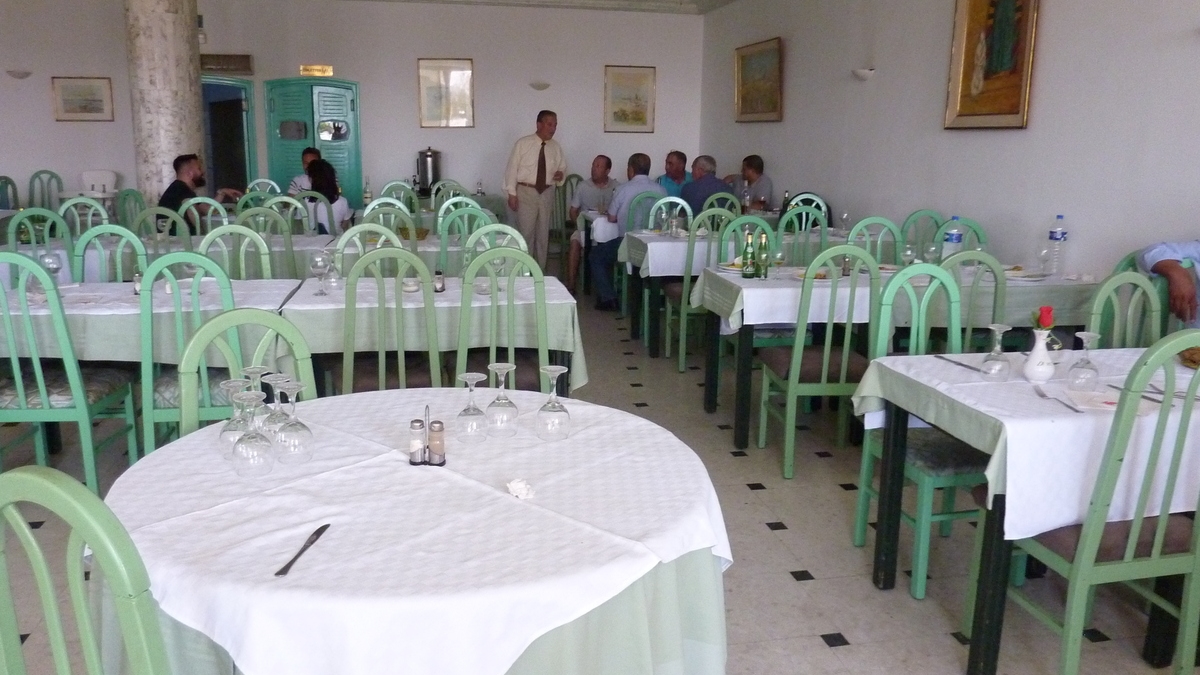A doua zi, am mîncat de prînz în Métlaoui, undeva între Tozeur și Kairouan (un fel de Mecca a Tunisiei), la Restaurant du Jardin, situat cumva la periferia orașului, într-o zonă mai degrabă industrială. Un complex cu ziduri și turnuri crenelate la poarta prin care autocarul trece spre imensa sală de mese dotată cu aer condiționat, special pregătită pentru grupuri mari de turiști. Chelnerii ne-au pus în față, rapid, o salată de castraveţi şi morcovi, cîte o porție de carne de vită cu garnitură de orez şi legume fierte și niște bucăţi de pepene galben, rece, trase în țepușă.