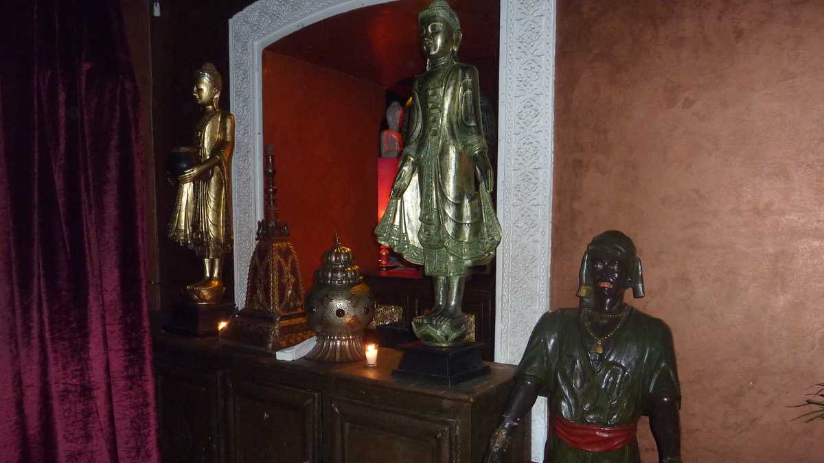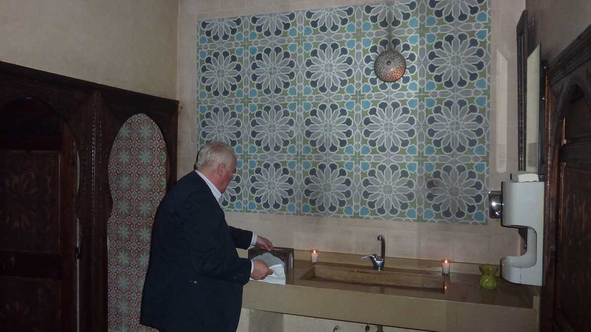 La masa României, între translatorul infotrip-ului în Vojvodina de acum cîțiva ani, Kamenko Milenkovic, realizator de emisiuni TV în Novi Sad, și Mike Black, jurnalist de turism din Liverpool (delegațiile fiecărei țări s-au așezat grupat, ca familiile la nuntă, dar ambasadorul sîrb și cel englez sînt invitații noștri speciali la o degustare în blind a pălincii de contrabandă adusă din țară și ferită de vederile musulmanilor organizatori), rasolesc absent cu furculița prin tajine-ul servit ceremonios de ospătar din castronul de lut direct în farfuria fiecăruia. Într-unul din drumurile la toaletă, studiasem atent zona luxoasă de lounge prin care se trece spre budă, atît de atent cît permitea semiîntunericul salonului luminat discret doar de lampadarele cu abajur și lumînările de pe mese, iar acum căscam gura la decoruri, tablourile de muzeu stil Lawrence of Arabia cît tot peretele, statuetele de beduini celebri și draperiile de catifea roșie care fac din Palais Dar Soukkar un loc foarte scump, în care nu orice marocan își permite să intre.