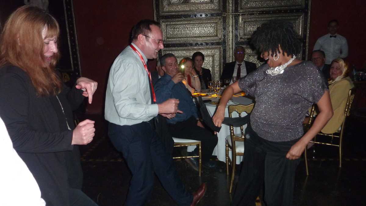 Din visul cu ochii deschiși pe pereții cinei basmului arab în care ne-au distribuit gazdele mă trezește paharul de vin roșu basculat de gesticulațiile vecinului din stînga, direct pe cămașa smoking-ului de cațavenc: Kamenko povestea foarte aprins ceva și probabil că engleza i se terminase. Ăsta a fost semnalul că trebuie să schimb poziția, așa că mi-am zis să animez puțin atmosfera gomoasă, invitînd-o la dans pe colega Gabi. Exact la timp: fix după numărul nostru coregrafic, a urmat show-ul lor oriental, în costume tradiționale, pe ritmuri de tobe africane, și jongleriile cu flăcări pe care ISU nu le-ar autoriza niciodată în interior, în puținul spațiu de pe mijlocul sălii aglomerat deja de consumatorii ridicați de pe la mese cu telefonul în mînă ca să filmeze.