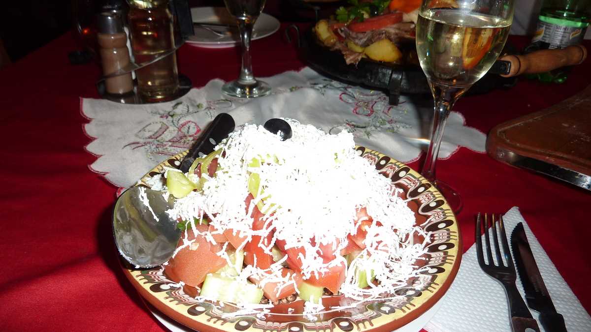 În fine, iată-ne în localul plin cu viitorii ghizi adunați de pe pîrtie sau din piscina hotelului, patru oameni (eu, Ioana, Dragoș 1 și Dragoș 2) așezați la o masă pe care, din meniul cu poze, s-au materializat o formă de pîine (doar coaja, fără miez), un platou cald mixed grill, niște salate tradiționale bulgărești shopska și o carafă cu vinul casei, un alb demisec.