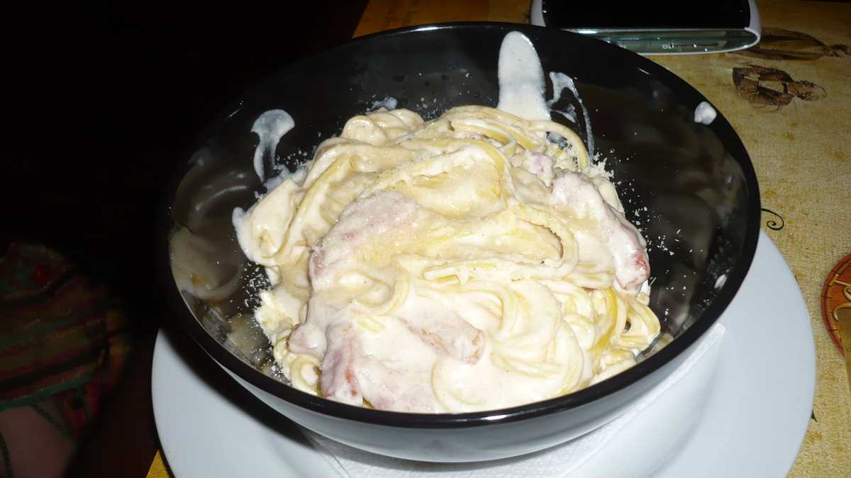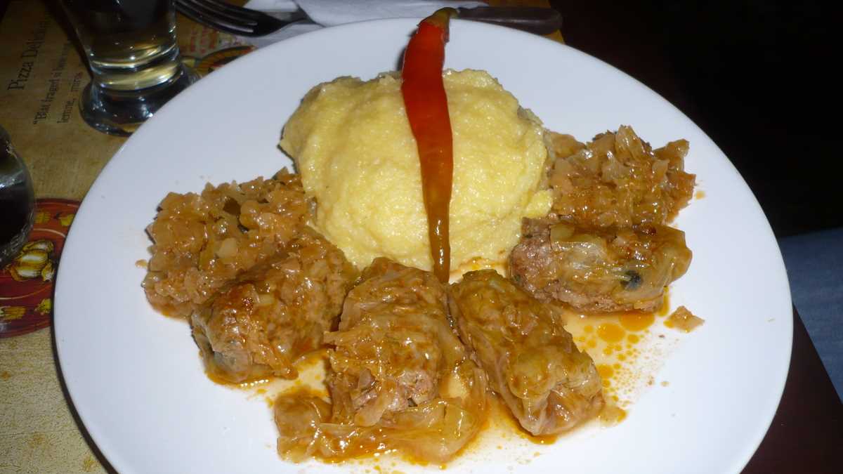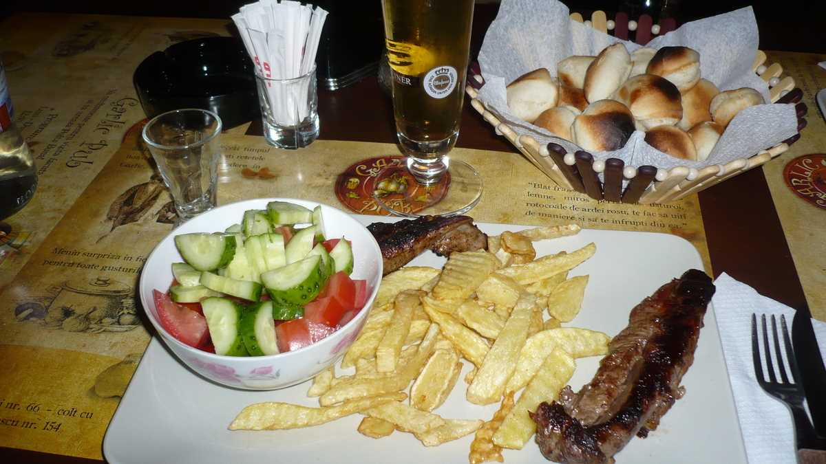Era puțin după prînz, aproape toate mesele ocupate, iar în aer dansau arome apetisante de busuioc, cimbru și cine știe ce alte mirodenii care ne-au invitat rapid foamea la vals. După o țuică de deschidere, deși nu sînt deloc fanul cărnii de oaie, la recomandarea expresă a ospătarului, am ales din meniu specialitatea casei: niște cotlete de berbecuț foarte bine făcute (dacă n-aș fi știut ce carne am în farfurie, nu mă prindeam c-a behăit pînă să ajungă în furculiță) cu cartofi țărănești și salată și o bere Warsteiner la draft. Fetele și-au luat supă cremă cu crutoane și sarmale cu mămăliguță, respectiv, spaghete carbonara.
