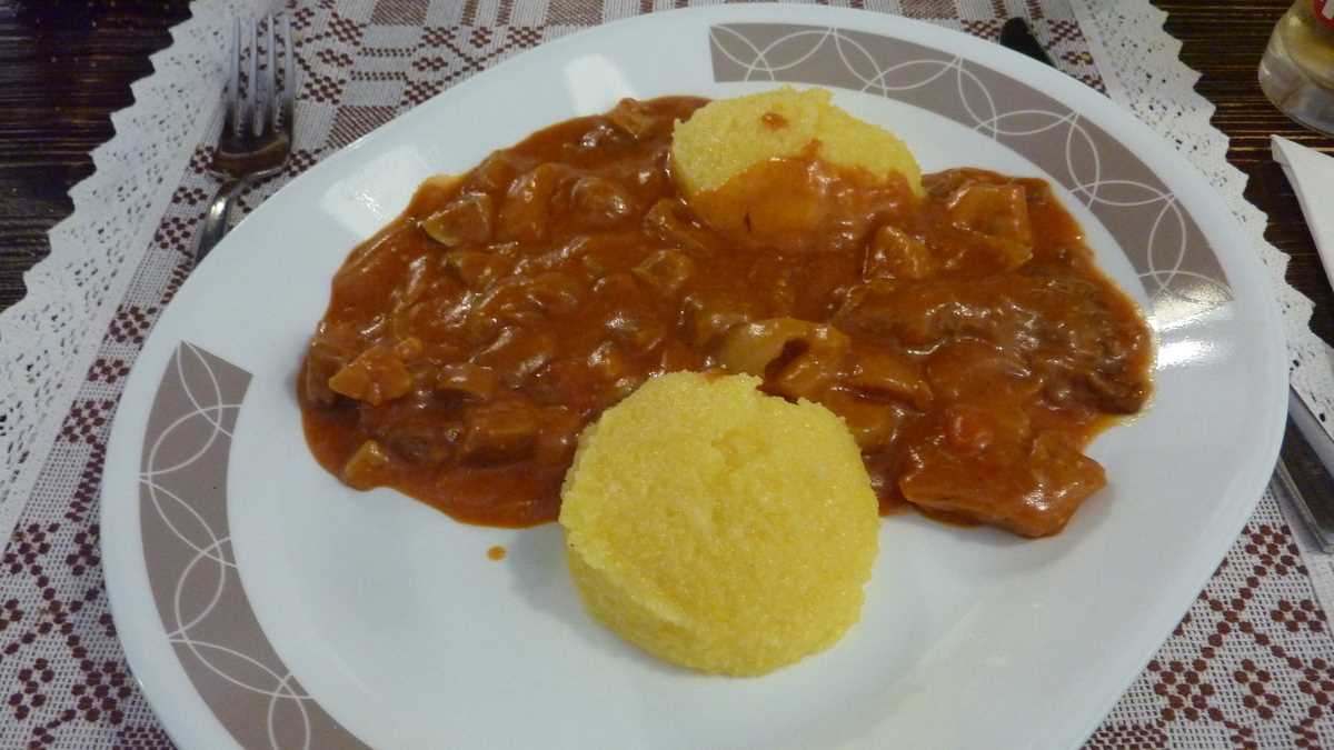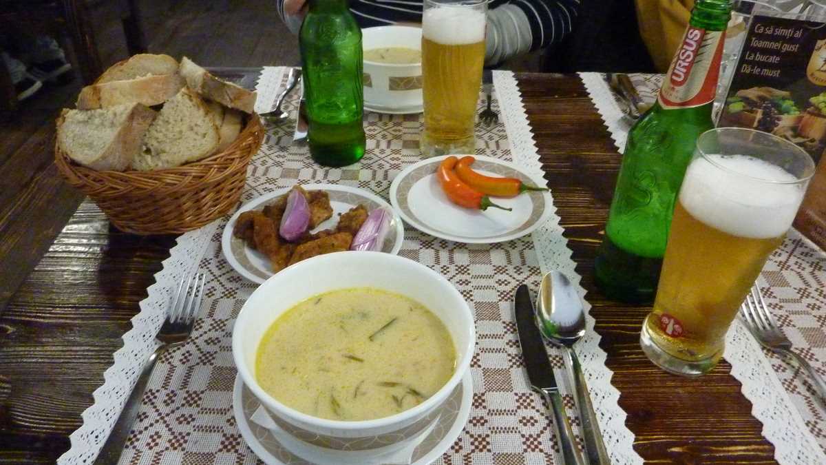 Prima dată ajunsesem aici acum vreo cîțiva ani, pentru o ciorbă de burtă de tratat mahmureala, îmi plăcuseră operativitatea chelnerului și priceperea bucătarului și de atunci revenisem de cîteva ori. Acum, intrat cu chinezul care voia neapărat să mănînce românește, l-am avertizat pe Valentin, ospătarul alocat mesei noastre, că ne grăbim, fiindcă ne așteaptă Contele Dracula la castel, și l-am lăsat pe el să ne facă o selecție din meniu, reprezentativă pentru gastronomia locală. Și omul s-a executat rapid: ne-a adus la masă clasica porție de jumeri cu ceapă din partea casei, niște pîine pe vatră, o zamă ardelenească cu ciolan afumat, tarhon și ardei iute, o tocăniță de bureți cu mămăliguță și cîte o bere la draft. Chinezul meu a înfulecat totul aproape fără să respire, lăsînd farfuriile aproape la fel de curate ca înainte să fie umplute.