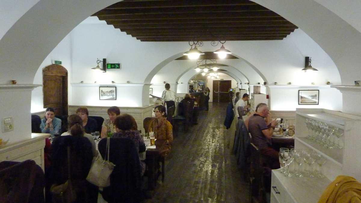 Oamenii ăștia inteligenți din Piața Sfatului o iau frumușel la pas cîteva sute de metri pe Mureșenilor, pînă la capătul dinspre Livada Poștei, și intră pe ușa situată chiar pe colț, la un pas de intersecția cu sens giratoriu, ca să coboare la subsolul clădirii în prelungirea căreia e Hotelul Aro. Și să ajungă într-un beci spațios a cărui toaletă cu senzori nu te lasă să te atingi de nimic în afară de apă și săpun, compartimentat cu mese în separeuri-nișă, în care se aude niște muzică populară în supersurdină și prin care se plimbă ceremonios cu platouri în brațe ospătari îmbrăcați în port popular brașovean.