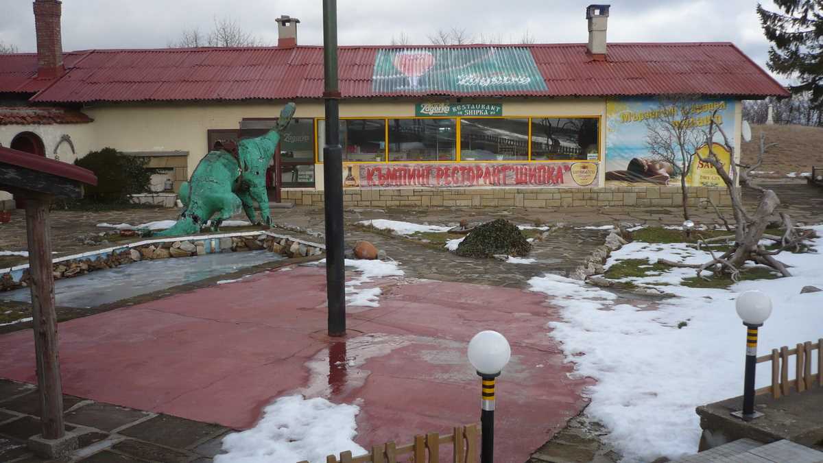 Situat în trecătoarea cu același nume din munții Stara Planina, în apropierea unui monument-turn din piatră – o tură de șah imensă care marchează locul unor partide sîngeroase ale turneului ruso-turc din 1877, în urma cărora alde Mustafa au fost făcuți de fiecare dată mat –, restaurantul face parte dintr-un complex turistic (motel & camping) fantastic. Fantastic, în sensul sugerat de următoarele imagini: în curtea stabilimentului, printre tunuri vechi, butoaie și roți de căruță, la bazinul artezianei sparte de lîngă terasa cu scaune de plastic, se adapă un dinozaur verde din fibră de sticlă. Interiorul, de bar sătesc construit parcă de un fan bulgar al serialului Twin Peaks, e decorat la fel de halucinant: blănuri, cranii și coarne de animale ciudate pe pereți, trunchiuri de copac contorsionat, ghivece cu plante pe care doar botaniștii ar ști să le catalogheze dacă sînt carnivore sau nu.