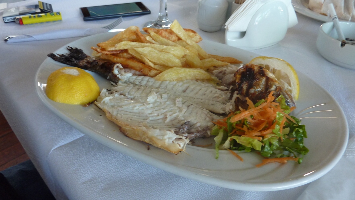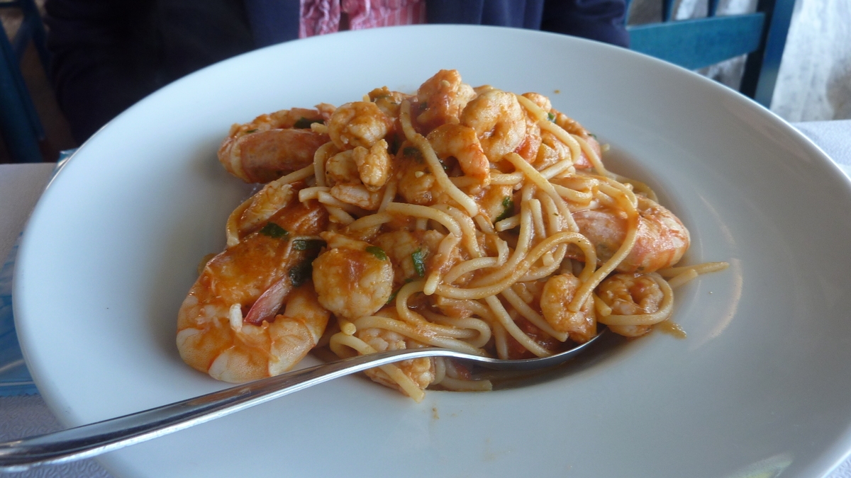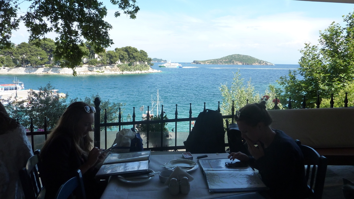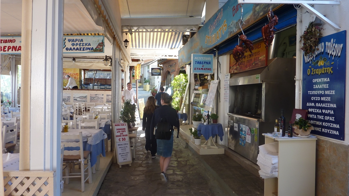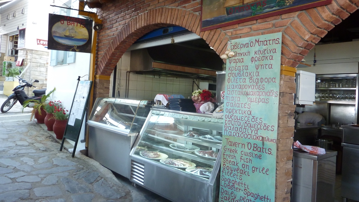 O Batis e undeva pe partea cealaltă a golfulețului cu marina din Skiathos Town, capitala insulei, chiar în față-stînga din stația de feribot, cum cobori cu trolerul din ferry-ul de Volos. Ca să ajungi la taverna asta fără să te rătăcești, după check-in-ul la hotel, te întorci aici și ții faleza care începe la statuia marinarului necunoscut pînă dai de străduța cu multe terase acoperite: O Batis e treia sau a patra. Un festin culinar aici (salată de legume cu măsline și nelipsita feta, pui cu cartofi înăbușiți, pește la grătar, paste cu creveți sau inele de calamar) e oferit la pachet cu o panoramă de mare. De mare efect, la una din mesele cu scaune din lemn albastre cu vedere la Egee.