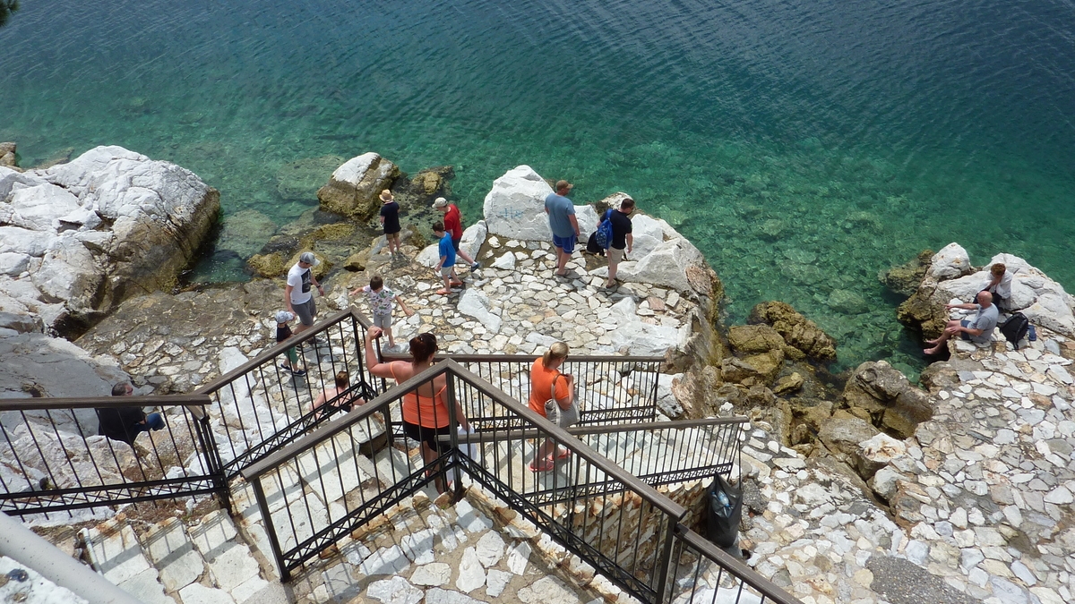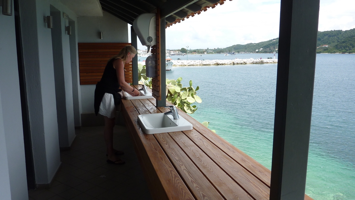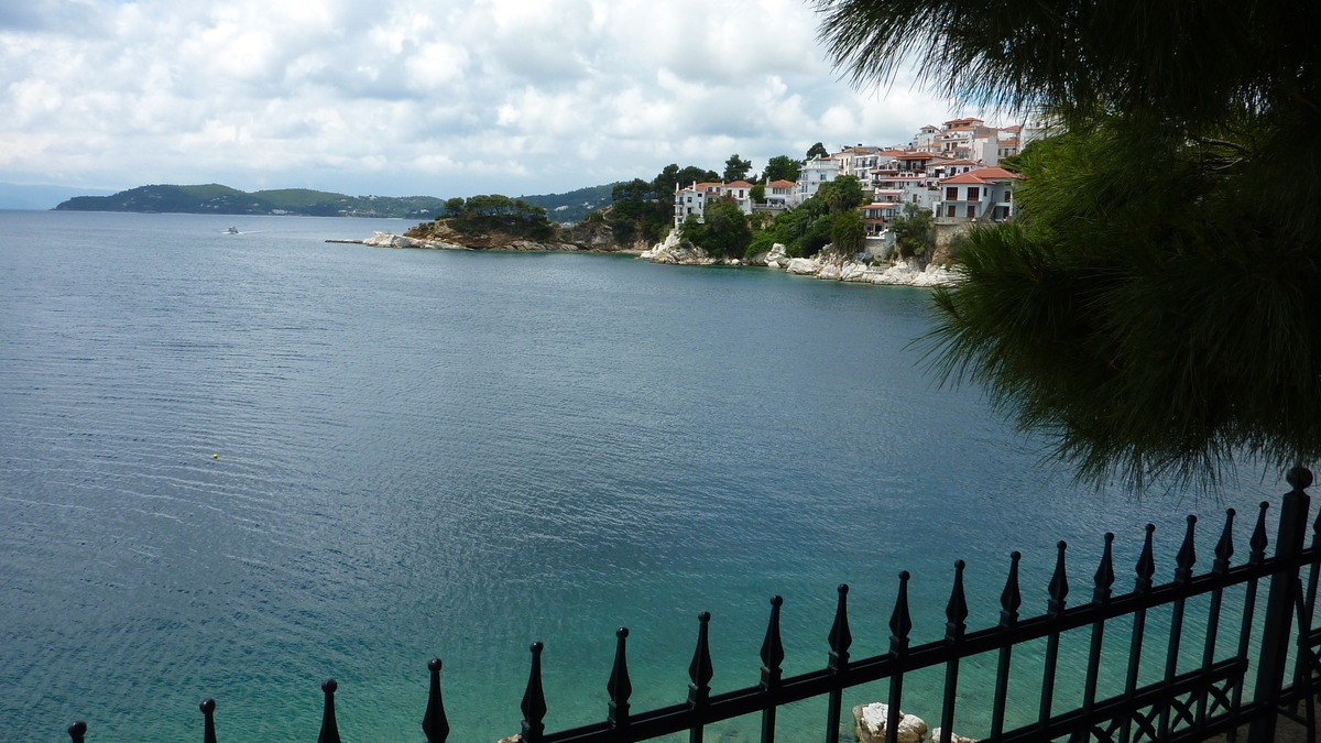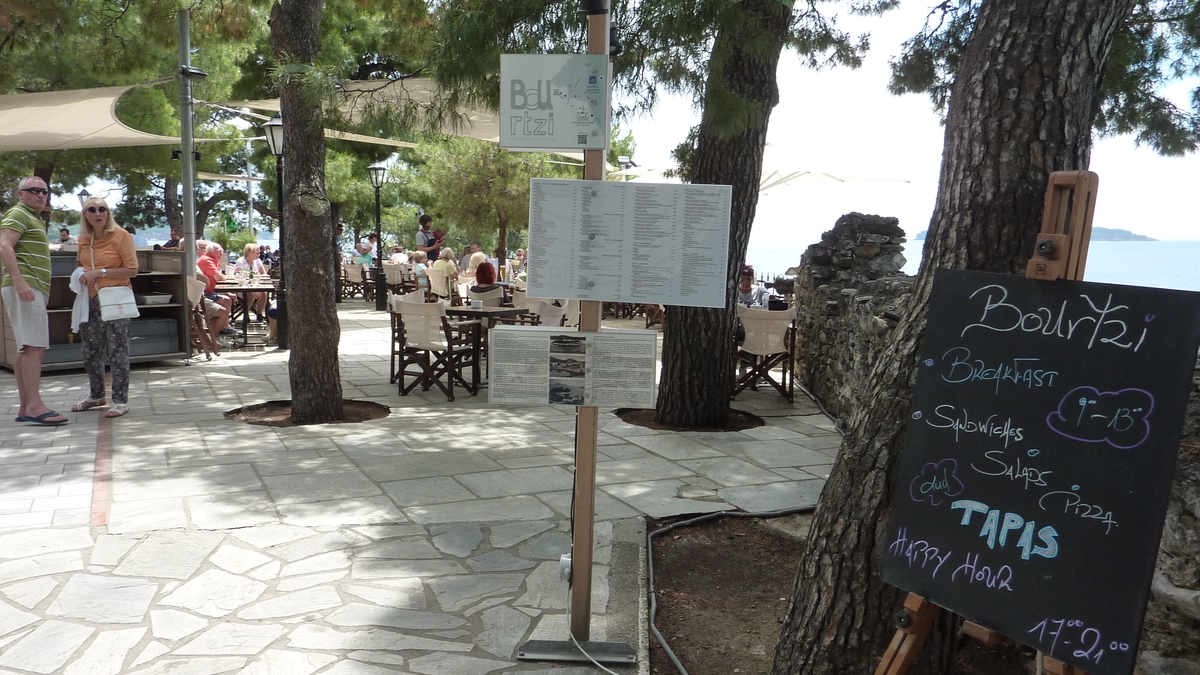 Înainte de avionul de întoarcere acasă, iată-te așezat la o masă în locul cu cea mai agitată istorie din Skiathos Town: fostă fortăreață de apărare împotriva dușmanilor care se apropiau pe apă, Bourtzi e acum un centru cultural și o terasă cochetă, la vreo zece metri deasupra mării, pe capătul abrupt al peninsulei micuțe cu același nume, printre tunuri ruginite, pini sălbatici, roci zdrențuite și cactuși abia dați în floare. Aici lumea savurează niște gustărele stil tapas, o bere sau o cafea, cu ochii cînd spre apa turcoaz care se întîlnește sub tine cu țărmul stîncos, cînd spre casele albe acoperite cu țiglă roșie îngrămădite pe colina cu biserică în vîrf, cînd spre charter-ul venit din țară care planează lin spre pista de aterizare aflată vreo doi kilometri mai încolo. Foarte interesant la terasa asta e peretele (lipsă) pe care te aștepți să fie oglinzile toaletei de pe platforma open space spre care cobori cîteva trepte de piatră: cînd te speli pe mîini și te uiți înainte, în loc să-ți vezi, ca la orice chiuvetă banală, fața de turist trist că pleacă, o să ai parte de un superb tablou marin cu natură vie.