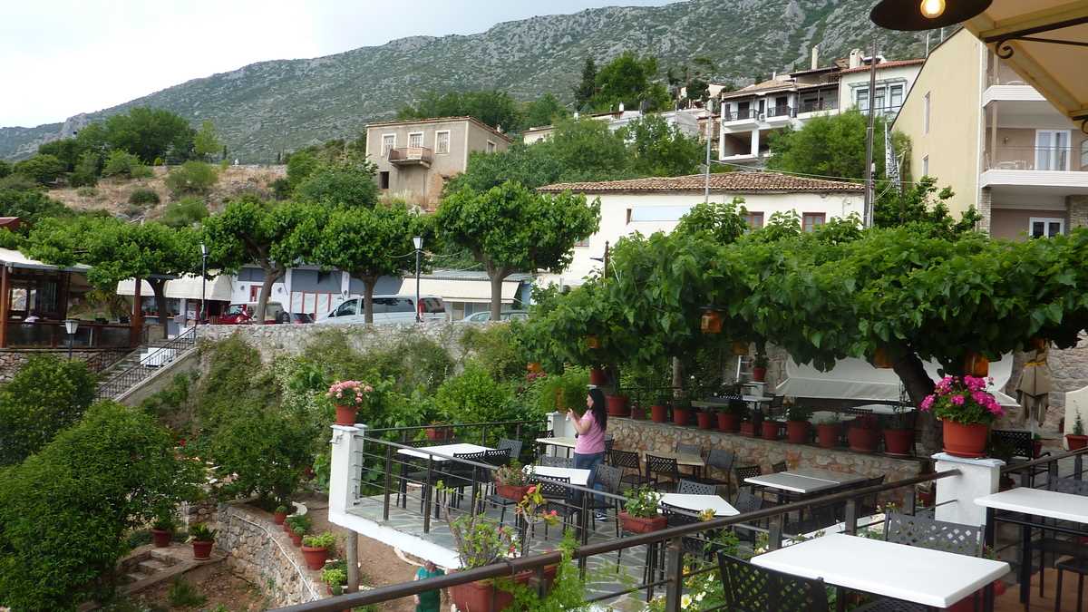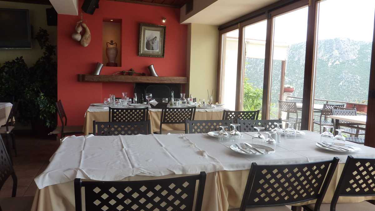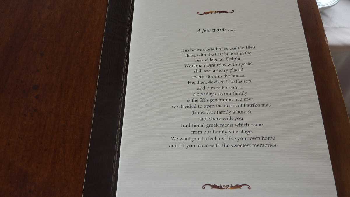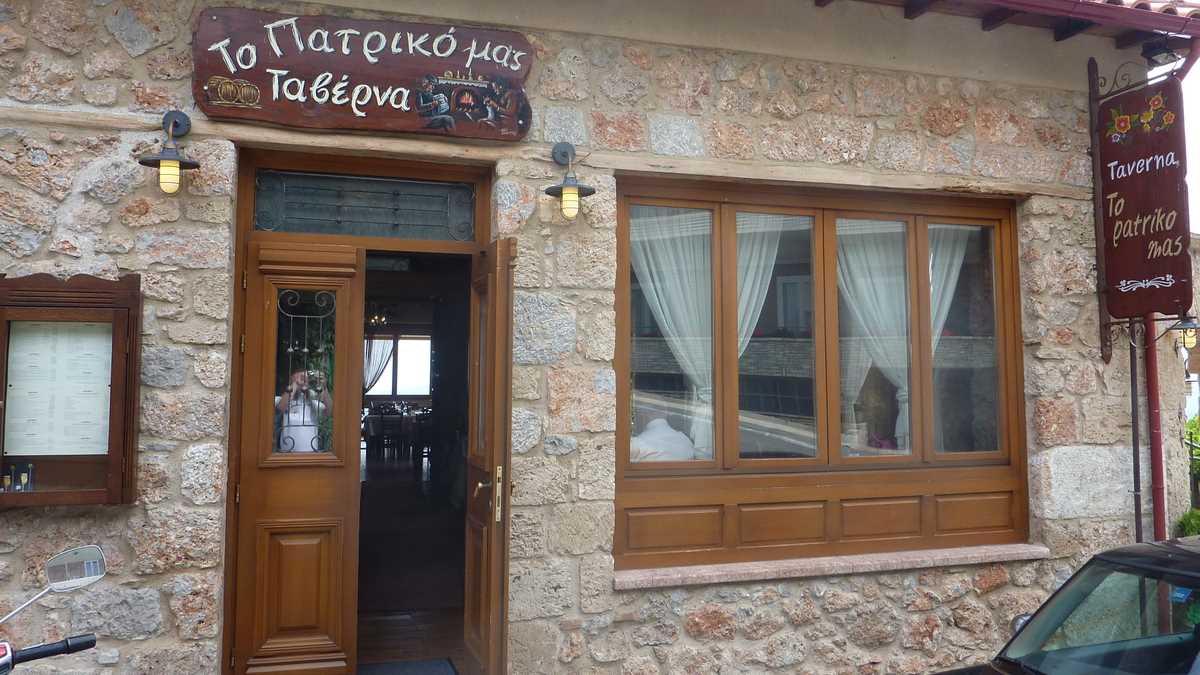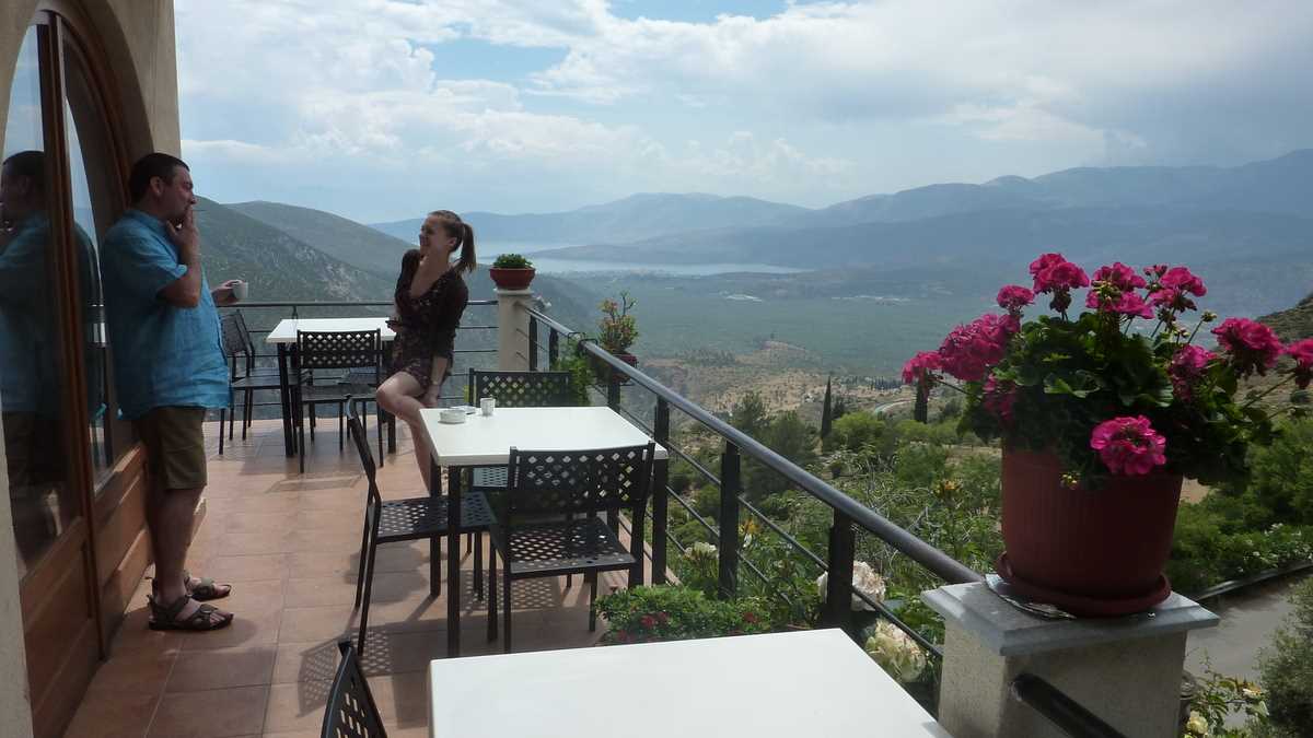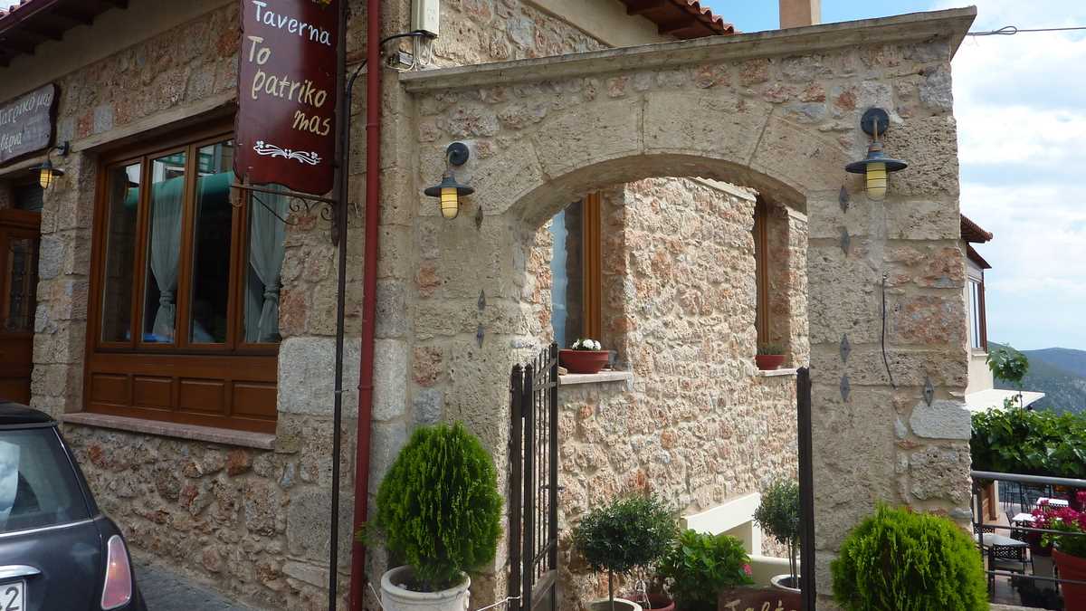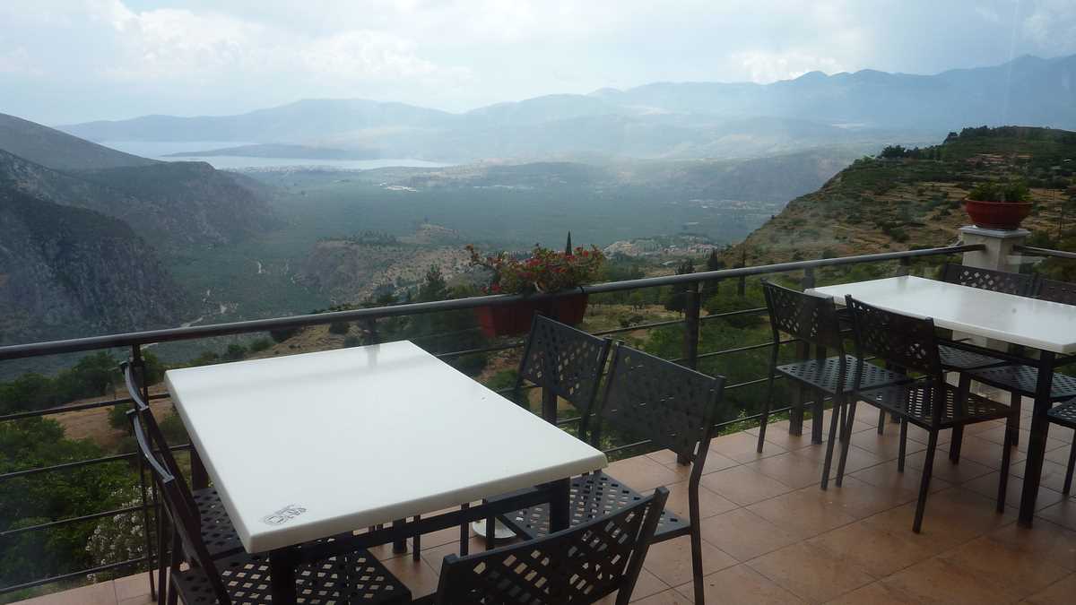 Cîștigătoarea concursului a fost To Patriko Mas, în curtea căreia am intrat direct din stradă, pe sub o arcadă de piatră lipită de fațada rustică a clădirii, coborînd cele cîteva trepte mărginite de amfore cu flori spre terasa pe două niveluri unde coroanele stufoase unite de viță-de-vie ale unor pomi făceau umbră meselor. Aici ne-am fi așezat pe scaune, cu ochii pe tabloul “Grecia, la țară“ care se desfășura în vale, peste grădinile și livezile de măslini ale dealurilor topite încet în marea de la orizont (ca să ajungi la Delphi, te îndepărtezi de Egee și urci vreo sută de kilometri spre interiorul peninsulei), dacă o rafală de ploaie rebelă nu ne-ar fi gonit înăuntru, după pereții vitrați care despart salonul de terase.