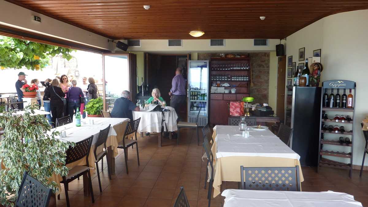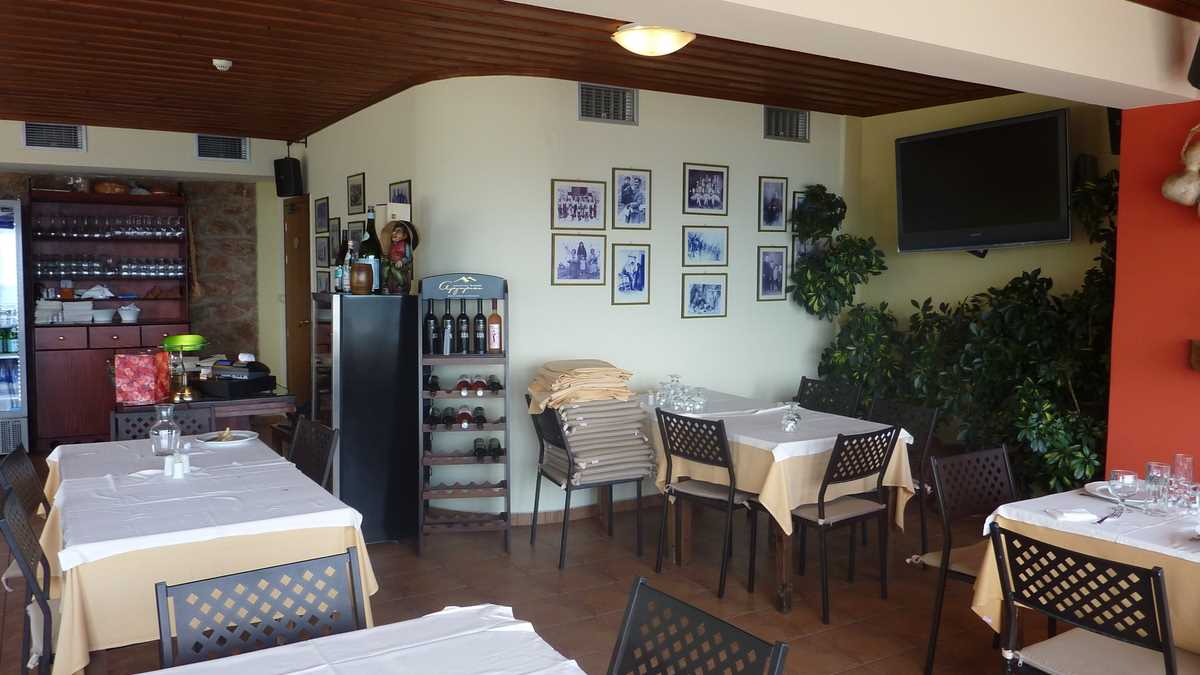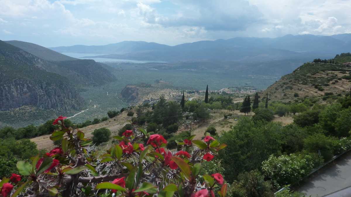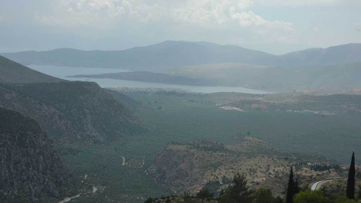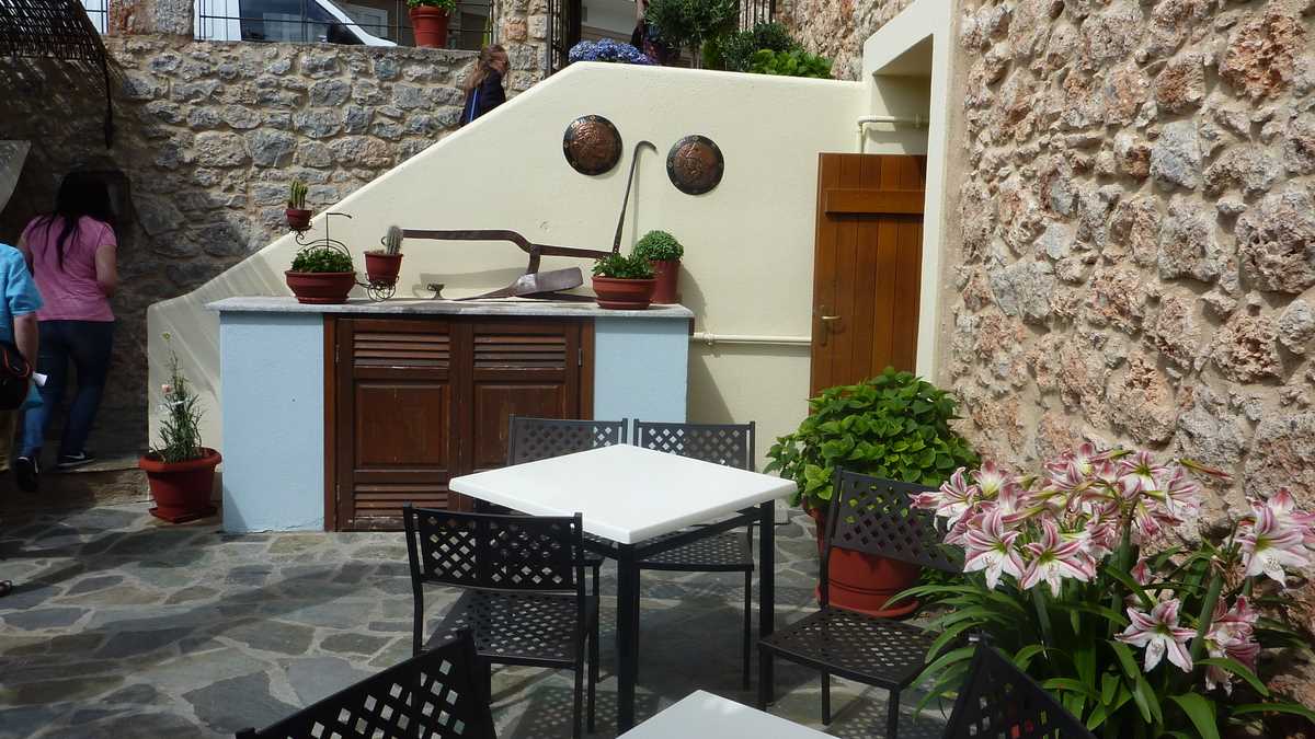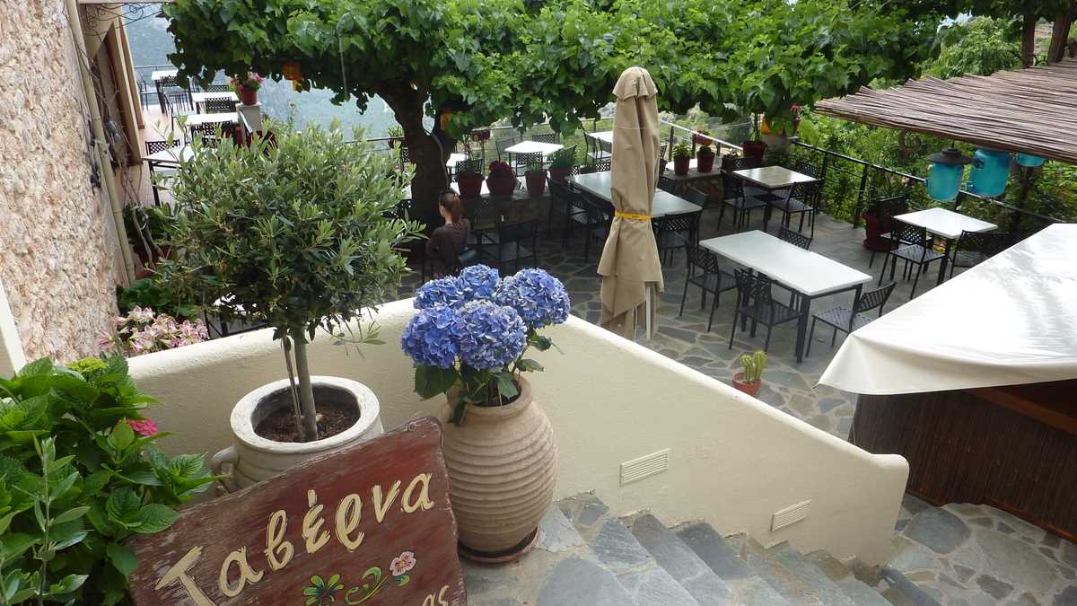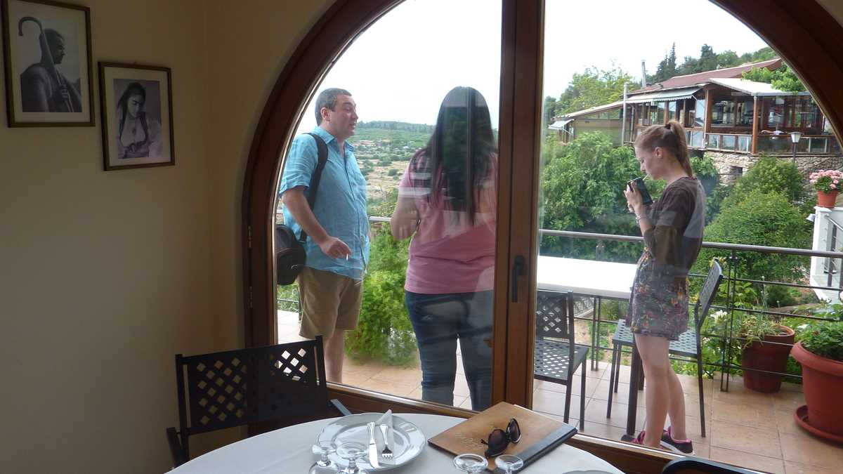 Cîștigătoarea concursului a fost To Patriko Mas, în curtea căreia am intrat direct din stradă, pe sub o arcadă de piatră lipită de fațada rustică a clădirii, coborînd cele cîteva trepte mărginite de amfore cu flori spre terasa pe două niveluri unde coroanele stufoase unite de viță-de-vie ale unor pomi făceau umbră meselor. Aici ne-am fi așezat pe scaune, cu ochii pe tabloul “Grecia, la țară“ care se desfășura în vale, peste grădinile și livezile de măslini ale dealurilor topite încet în marea de la orizont (ca să ajungi la Delphi, te îndepărtezi de Egee și urci vreo sută de kilometri spre interiorul peninsulei), dacă o rafală de ploaie rebelă nu ne-ar fi gonit înăuntru, după pereții vitrați care despart salonul de terase.