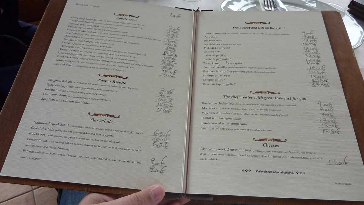 Pozele alb-negru înrămate pe pereții interiori dezvăluie că To Patriko Mas e o afacere de familie. L-am întrebat pe grecul politicos și rezervat care ne condusese la masă, după ce se asigurase că-i suficientă a table for five și care, după atitudine, părea patron, ce înseamnă înșiruirea de cuvinte de pe firmă și dacă Patriko e cumva numele său, pentru că mie, traducerea în românește îmi suna ceva în genul La masa lui Petrică. Răspunsul lui scurt, It means “Our family‘s home“, l-am găsit dezvoltat în povestea de pe prima pagină a meniului despre stră-stră-bunicul său Dimitrios care, pe la 1860, punea piatră peste piatră casei în care tocmai intrasem.
