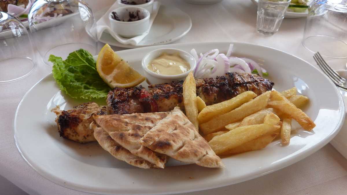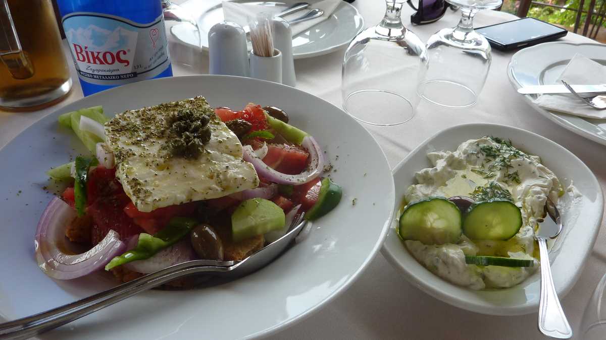 Despre mîncare foarte puține, pentru că nu-i frumos să vorbești cu gura plină. Prima dată au apărut pe masă un Raki Tsilili, rachiul local recomandat de chelnerul-patron și aperitivele-cadou de la bucătar, pîinea prăjită, pasta de măsline și salata tradițională cu multă feta, din care am fost invitați să gustăm toți cinci. Abia apoi au venit farfuriile și sticlele comenzii (souvlaki ca la mama lui acasă, 10 euro, și bere nefiltrată Delphi, 330 ml, 6 euro, pentru mine), pe care le-am golit în timp-record.