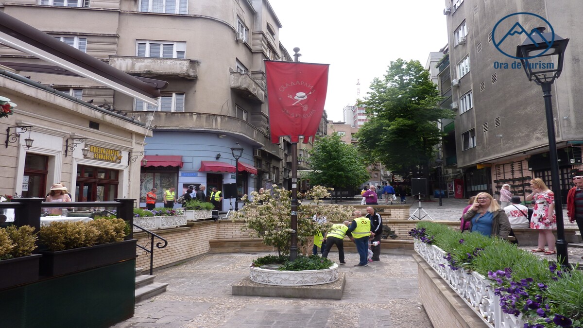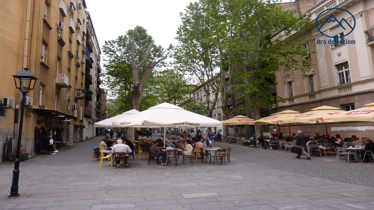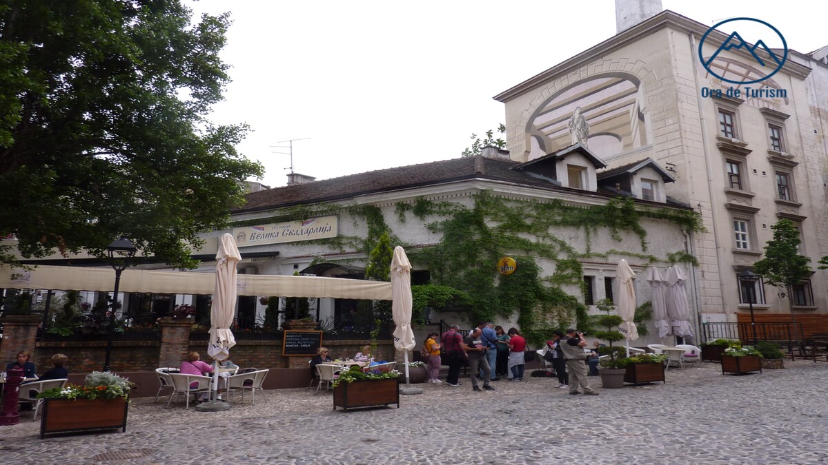 Ne-am oprit mai întîi în capătul de sus al străzii care coboară lin din bulevard, acolo unde niște reporteri se agitau în fața unor camere TV. Nedumerirea ni s-a risipit întrebînd oamenii din jur: era chiar deschiderea oficială a sezonului turistic în Belgrad și șeful departamentului de turism al primăriei belgrădene dădea interviuri pentru media. Nu se putea noroc mai mare, să ajungem la subiectul știrii momentului fără să fi avut habar de asta… După ce i-am luat cîteva vorbe pentru un material complet neprogramat, am întrebat-o pe Jelena, ofițerul de presă al departamentului, unde ne recomandă să mîncăm, cîrciumile zonei părînd cam ocupate. Foarte amabilă, proaspăta noastră cunoștință ne-a rezervat o masă de zece locuri pe terasa cu mobilier din fier forjat și copertină retractabilă a restaurantului Velika Skadarlija, chiar acolo unde era programat să-i strîngă după eveniment pe toți jurnaliștii locali la o cafea, o friptură și o bere.