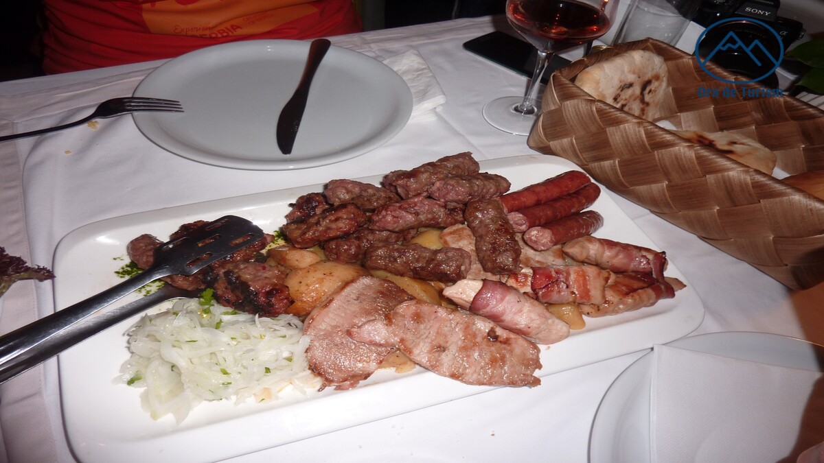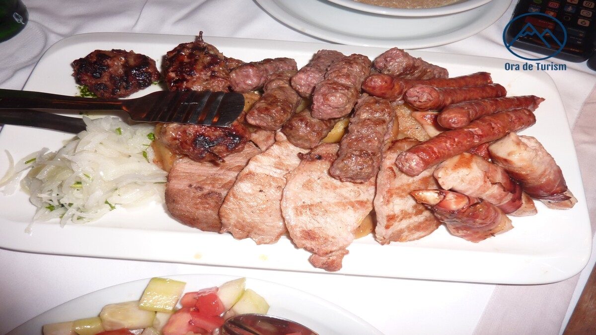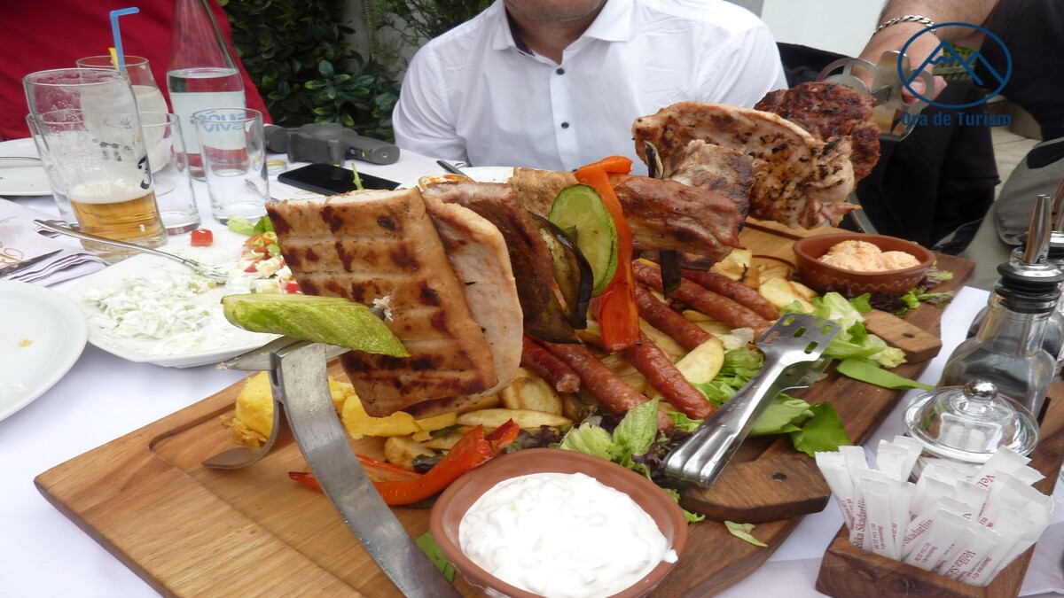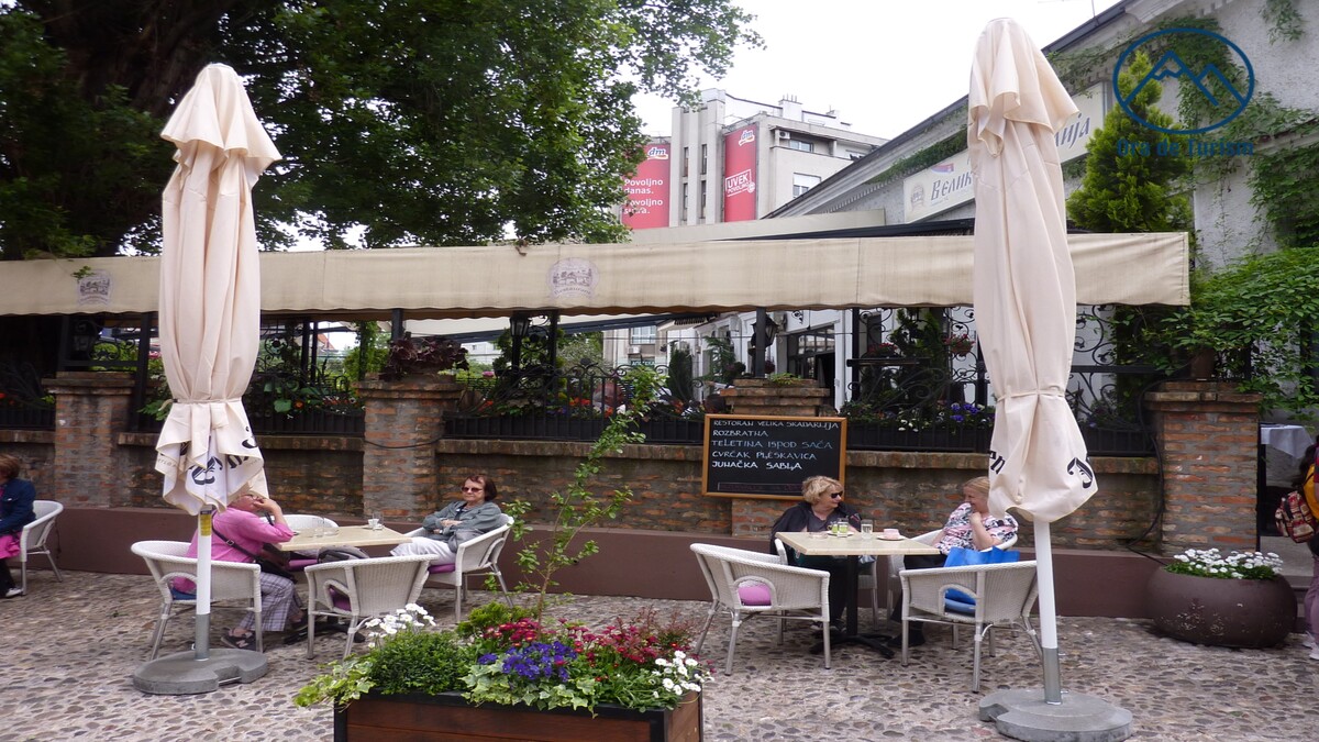 După ce ne-am așezat într-un colț, lîngă gard, într-un fel de separeu semiprivat delimitat oarecum de o perdea de vegetație de curtea casei vechi cu iederă pe fațadă și fîntînă arteziană între mese, l-am cunoscut pe Dejan, ospătarul old school care a adus meniurile și ne-a întrebat pe un ton profesional cu ce am dori să fim serviți. Nu doream ceva anume; din interacțiunea cu el, am realizat că-i suficient de experimentat ca să mergem pe mîna sa, așa că l-am lăsat să ne aducă ce are mai tradițional și mai “trebuie neapărat să guști“ în bucătărie și în bar. Și Dejan nu ne-a dezamăgit. A venit mai întîi cu niște rakija, la aperitivele pe platou din lemn (păstrămuri, brînzeturi, jumări) însoțite de pîinea-baghetă, sub formă de sticks-uri ceva mai mari. Apoi s-a prezentat cu piesa de rezistență a meniului, porcăriile la grătar înfipte spectaculos în niște săbii de mare efect, mai ales la fotografii de Facebook și Instagram ai grupului. De la festin n-au lipsit, desigur, băuturile locale, berea Jelen sau vinul alb sec (două soiuri degustate personal, ambele chiar OK).