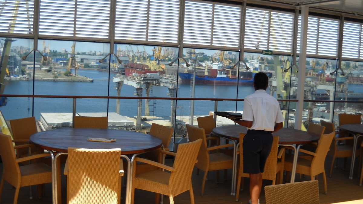 Probabil că mulți vizitatori au visat pentru cîteva momente cam cum ar fi să rămînă întinși pe un șezlong, cu un cocktail în mînă, lîngă piscina de pe puntea superioară, și să se trezească abia pe la Soci. Spălînd vase din poziția temporară de Dish Washer Manager, post înființat special pentru pasagerii de croazieră foarte scurtă, pînă la debarcarea forțată în primul port.