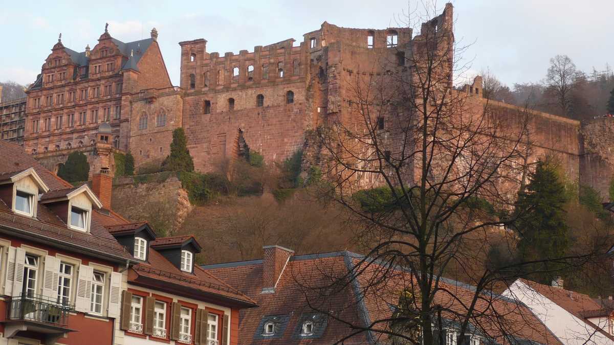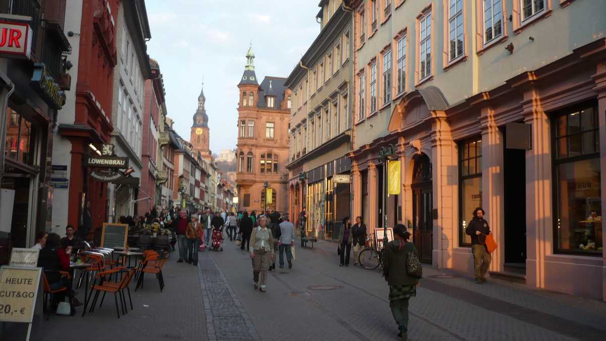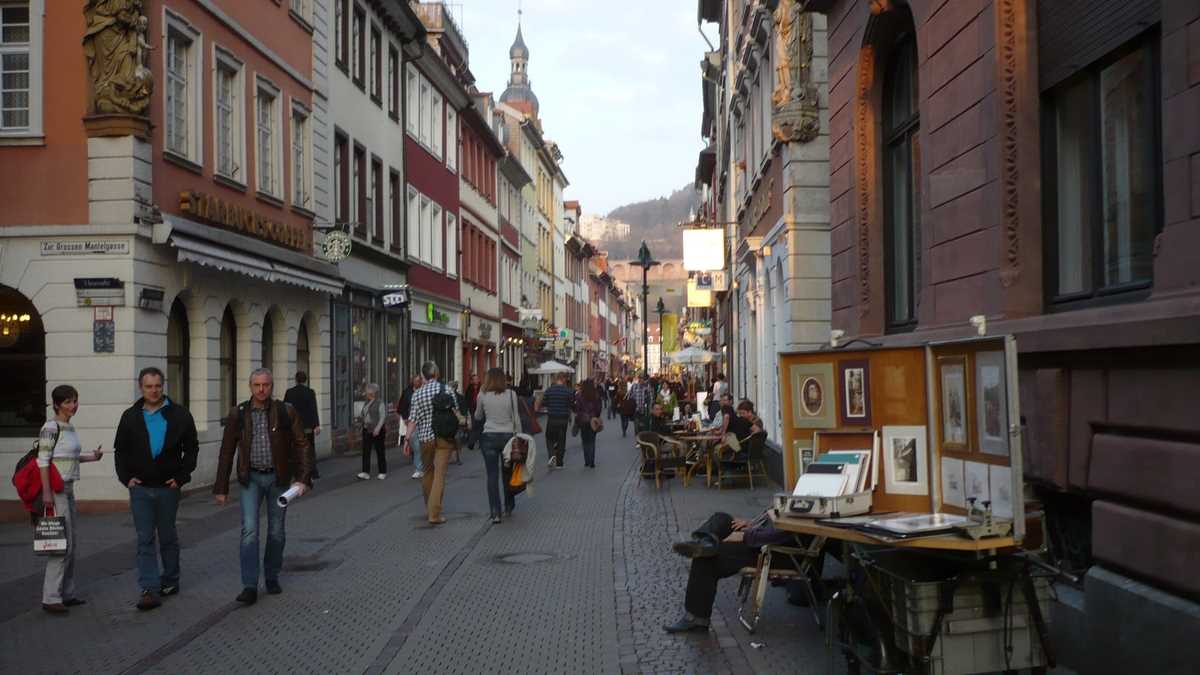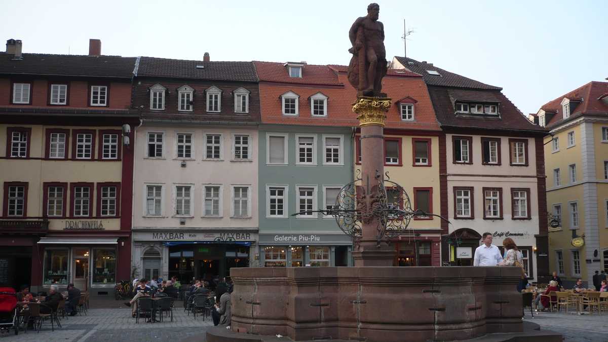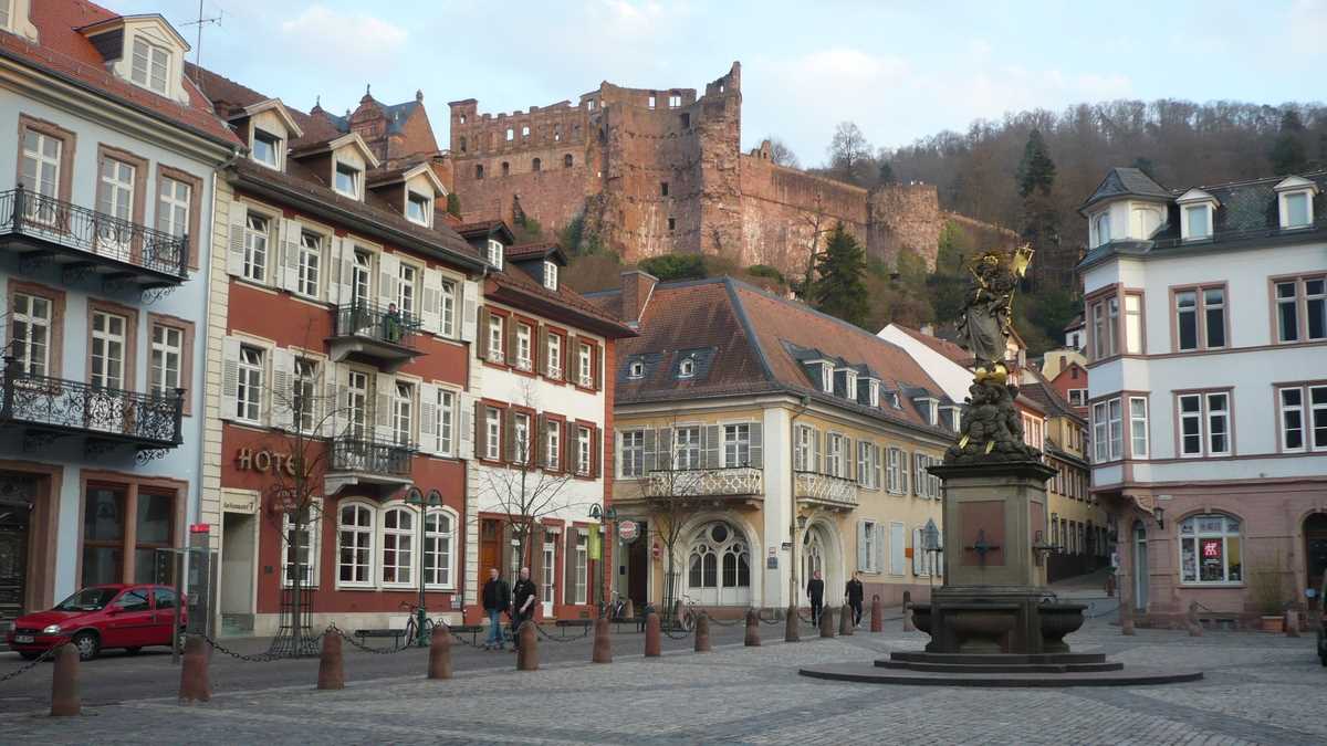 Ajungeam, deci, în Heidelberg, într-o vineri, spectatori punctuali la un glorios apus de soare privit de pe malul nordic al rîului Neckar (cel cu vedere spre centrul orașului), printre gîște care pasc liniștite și oameni veniți la picnic, pe bicicletă. Iar la sfîrșitul show-ului, treceam podul spre Altstadt, Orașul Vechi, dominat de pe o colină de castelul medieval Heidelberg Schloss și traversat de strada principală Hauptstrasse, pietonala cu terase și magazine dintre Bismarckplatz și Marktplatz, piața bisericii gotice Heiliggeistkirche.