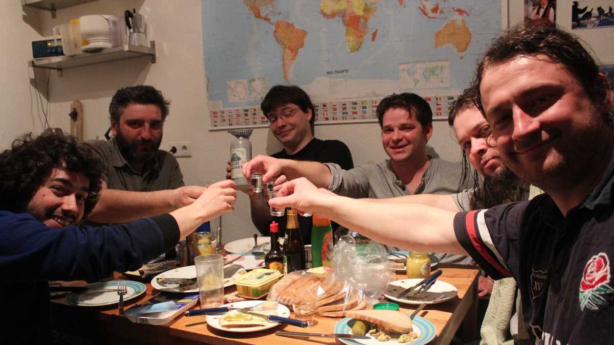 Peste drum, în Sonderbar (nume alternativ Betreutes Trinken; se traduce, aproximativ, “Bețivul asistat de profesioniști”), atmosfera e la fel de tovărășească, în sensul că fiecare bea după nevoi și plătește după posibilități. Plin și ăsta, dar parcă mai puțin înghesuit decît dincolo. Patronul barman, un sexagenar încă verde, cu părul alb prins în coadă, e foarte agil: cu o mînă îți toarnă o halbă de Radeberger și-ți ia 3 euro, iar cu cealaltă pune un rock vechi, în timp ce tu, privind mascota casei, puiul din cauciuc spînzurat deasupra barului, te întrebi cît o fi băut de-a ajuns în starea asta.