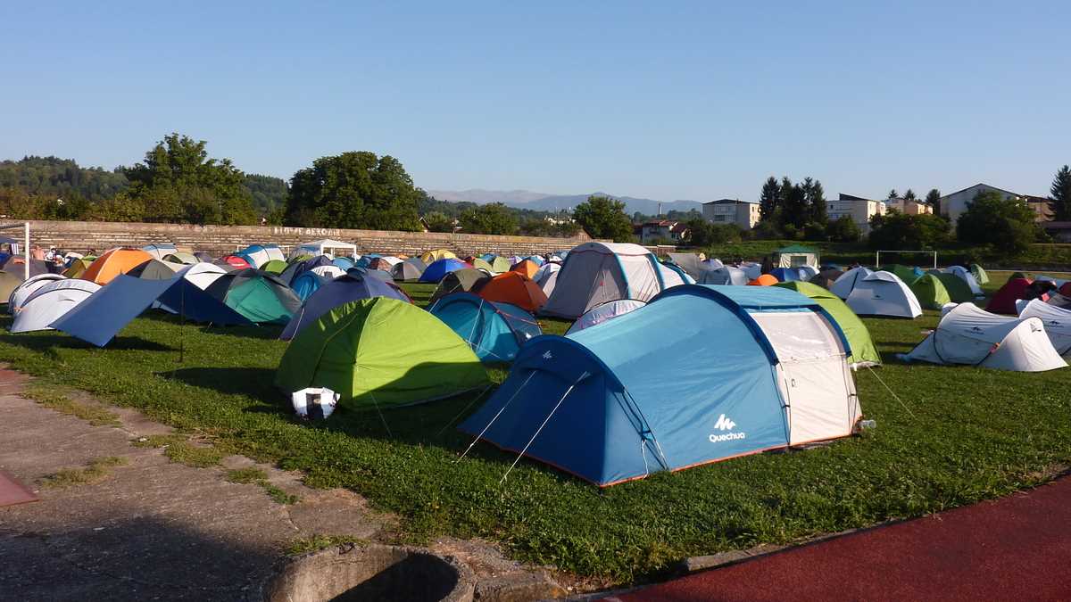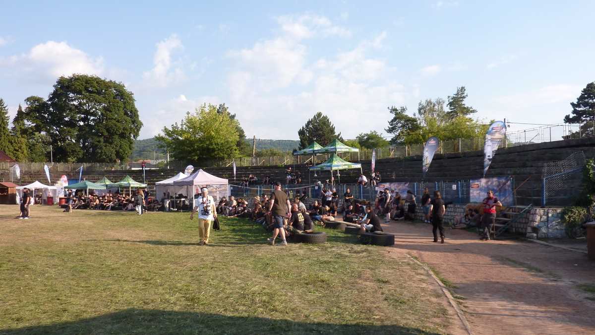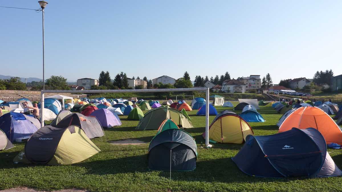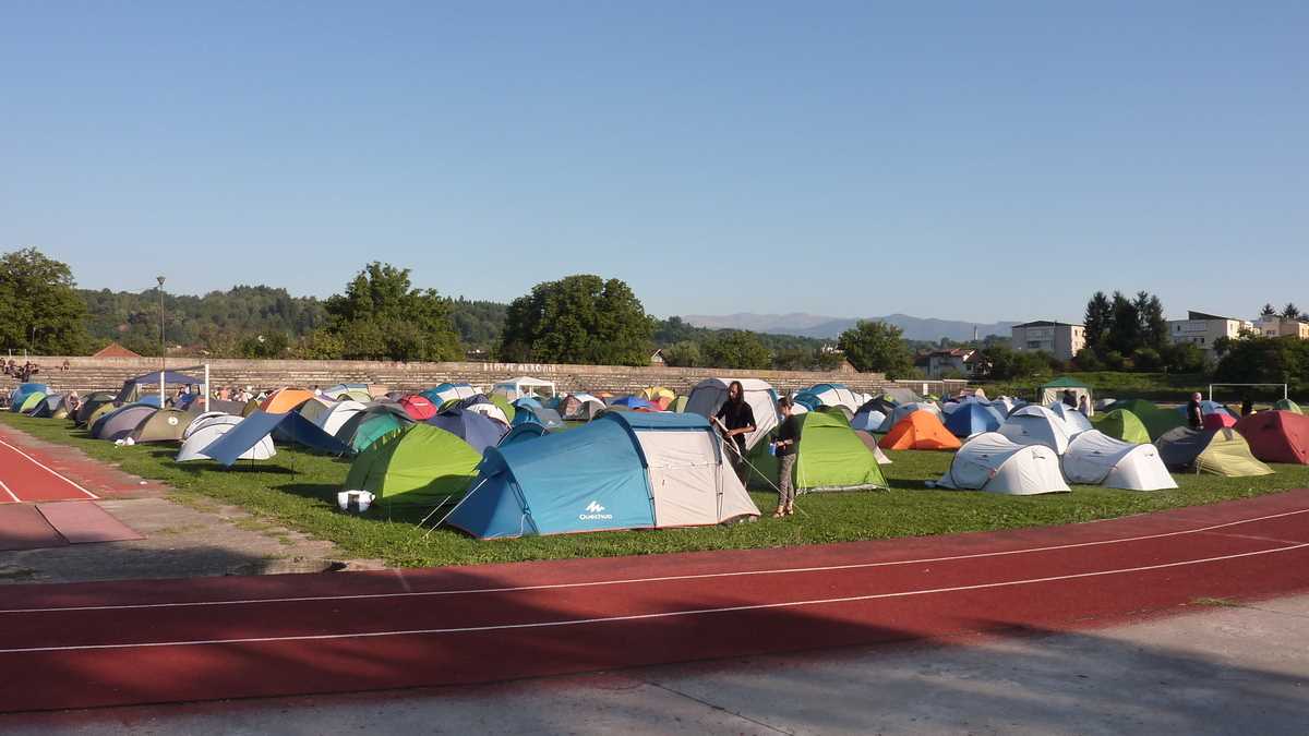 Locul: În zona stadionului municipal, pe unul dintre terenurile de fotbal ale complexului sportiv, s-a construit pentru trei zile, ca la Rockstadt Extreme Fest, un minicartier de cîteva sute de corturi locuit de cetățeni din toată țara. Un minicartier de pînze viu, care a trăit non-stop, zi sau noapte: s-a cîntat, s-a băut, s-a discutat și s-a dormit (doar cîteva ore, spre dimineață, pînă cînd soarele îți dădea deșteptarea împingîndu-te afară dintr-o atmosferă de saună uscată). Aici mi-am plantat și eu cortul, de vineri după-amiază pînă luni dimineață, lîngă poarta dinspre scenă, în careul de 6 metri, undeva pe locul de unde ratează toți fotbaliștii celebri.