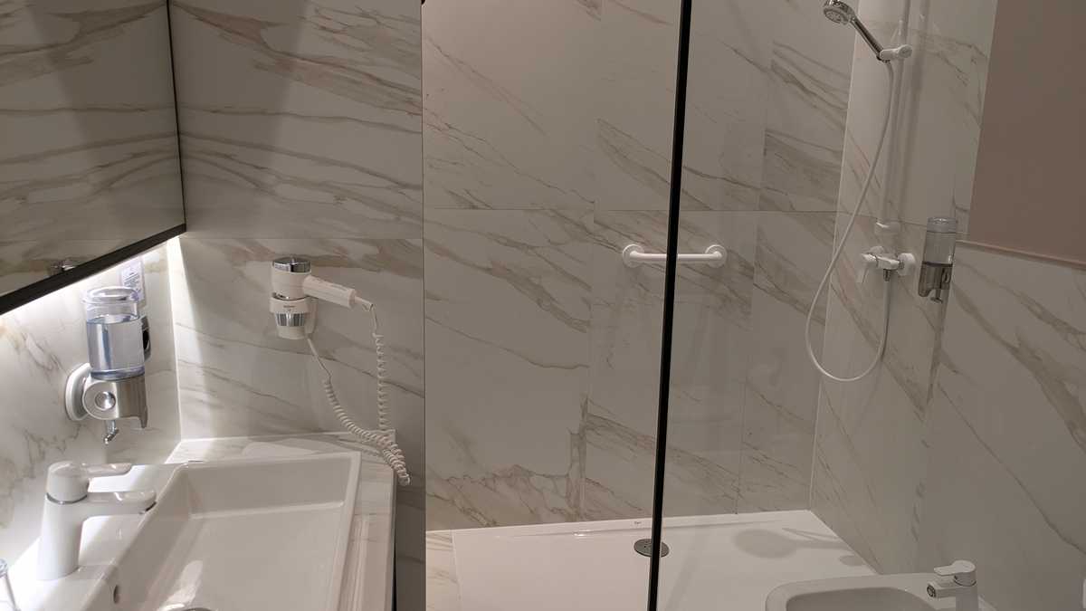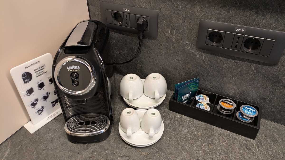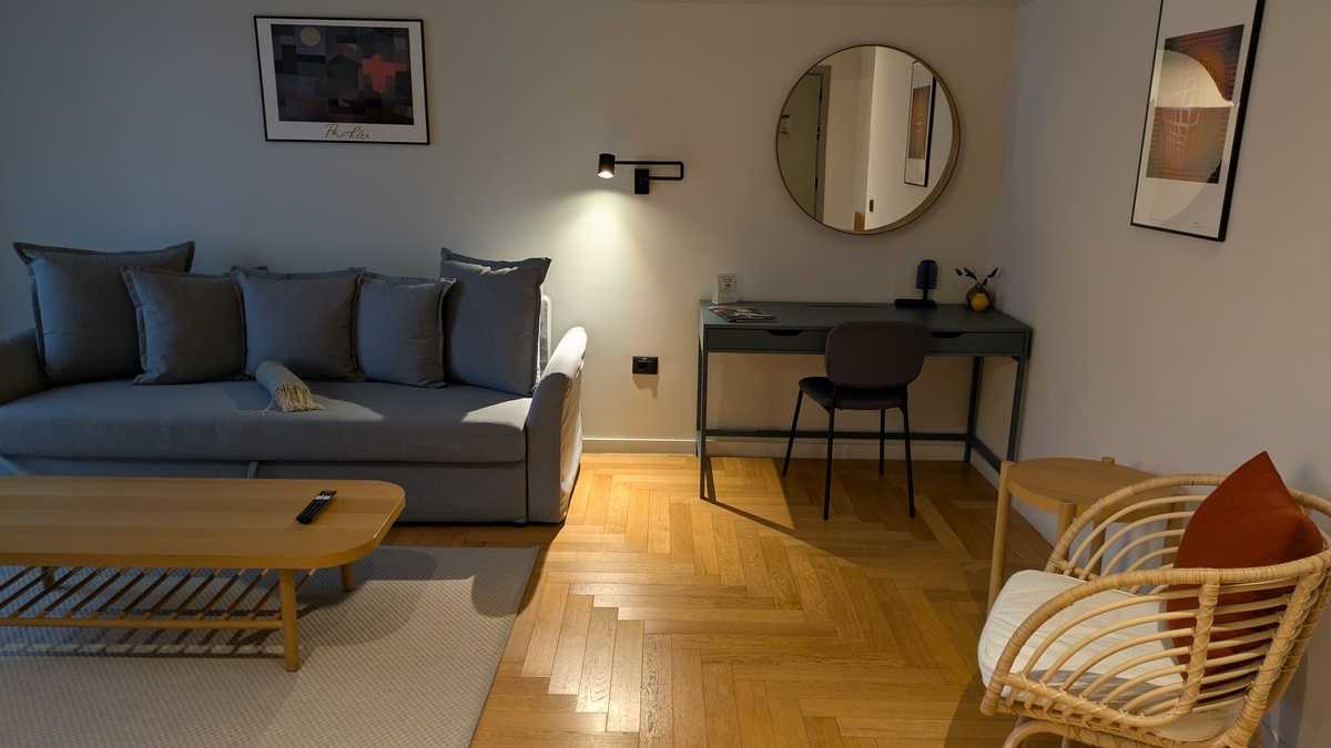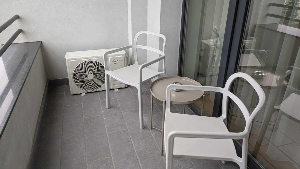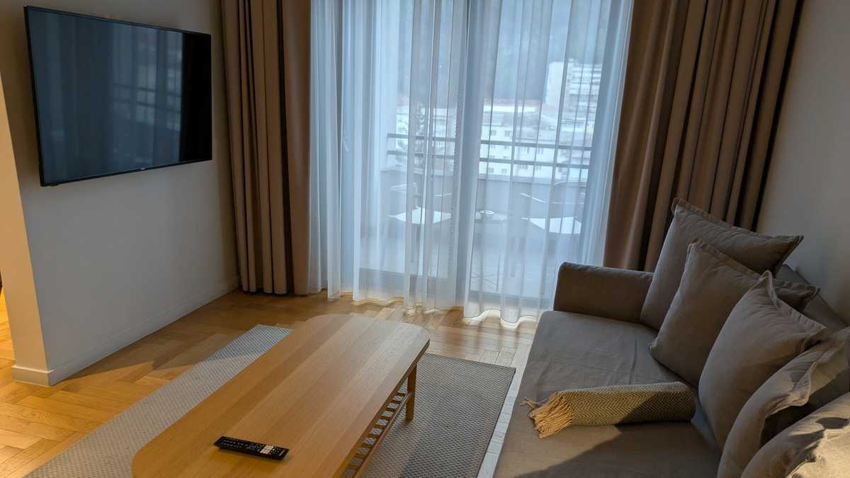 Dotările: 401 e un habitat plăcut, la care aș upgrada și interiorul de acasă. Living-ul, mare și aerisit, are patru uși: două de intrare, în dormitor și în baie, și două de ieșire, pe holul palierului și pe balconul cu vedere la o parte din acoperișurile centrului. Cea mai importantă piesă de mobilier ar fi canapeaua din fața smart-TV-ului rămas nedeschis, pe care nu m-am așezat nici măcar de probă. Dacă ai musafiri, asta ar fi zona în care să stați de vorbă, la o ceașcă fierbinte de cafea din capsulă sau ceai din plic, preparate rapid în colțul de bucătărie open space complet utilată.