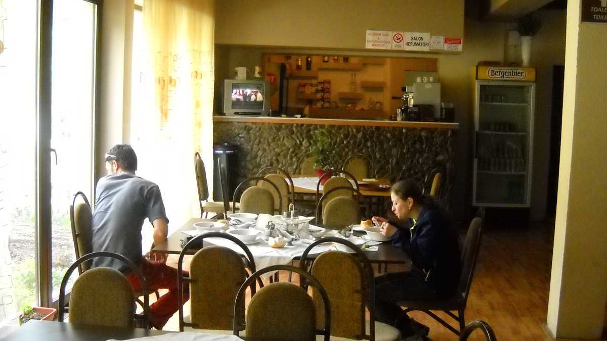 Ambianță: De salon de nuntă de cartier în pădure. Cel puțin, în restaurant, singurul loc vizitat, asta a fost impresia: din natură intri direct într-un spațiu decorat cam pretențios, neasortat cu atmosfera montană, ca să nu zic de-a dreptul kitsch (parchet laminat, sfeșnice, perdele și draperii somptuoase, ceas electric de perete ornat Ludovic Chenz, lustre-felinar, bar placat cu piatră stilizată). Dar, cînd ți-e foame, ești dispus la unele concesii; contează mai puțin detaliile de ordin estetic, alte simțuri primează. Așa că, la plecare, pentru că gustul ne-a convins, am lansat o rezervare de ciorbe rădăuțene și pentru duminică, la coborîre. Apropo, n-a fost nevoie să cerem meniul: e postat pe perete, în fotografiile farfuriilor pline cu specialitățile locului. De la tochitură moldovenească, păstrăvi din Bistrița la grătar și hribi de Rarău cu usturoi la paste carbonara, valdostana și salată bulgărească.