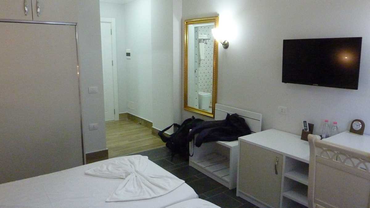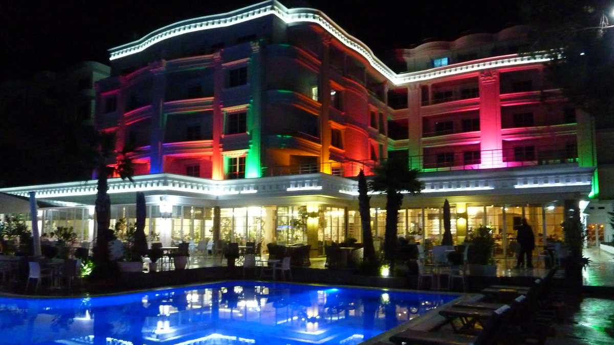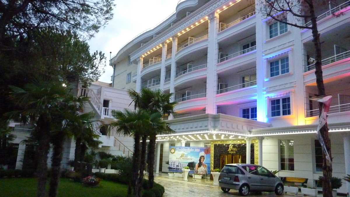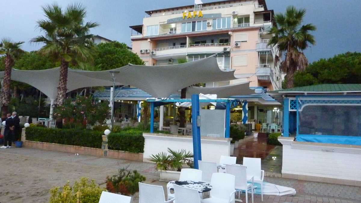 Dotările: Cinci stele albaneze ieftine sînt echivalentul a patru stele cu minus / trei stele cu plus, în sistemul știut de categorisire. Pentru că finisajele nu sînt partea forte a albanezilor: în baia fără cabină de duș și cadă, peretele de rigips tăiat greșit, pe lîngă panoul bazinului, a fost lăsat așa, cu operația deschisă și instalațiile vizibile, router-ul e agățat de tavan în hol (apropo, Internetul hotelului, îngenuncheat de prea multe conexiuni, leșină cîteodată subit), aerul condiționat instalat fix deasupra patului, odată pornit, îți flutură pletele pe pernă. Dar, dacă nu ești atent la detalii și-ți iau ochii opulența lobby-ului și a lifturilor, piscina înconjurată de palmieri multicolor luminată noaptea, plaja privată cu șezlonguri sub umbreluțe și camerista care schimbă zilnic prosoapele, cu ceva indulgență, FAFA trece clasa spre premium.