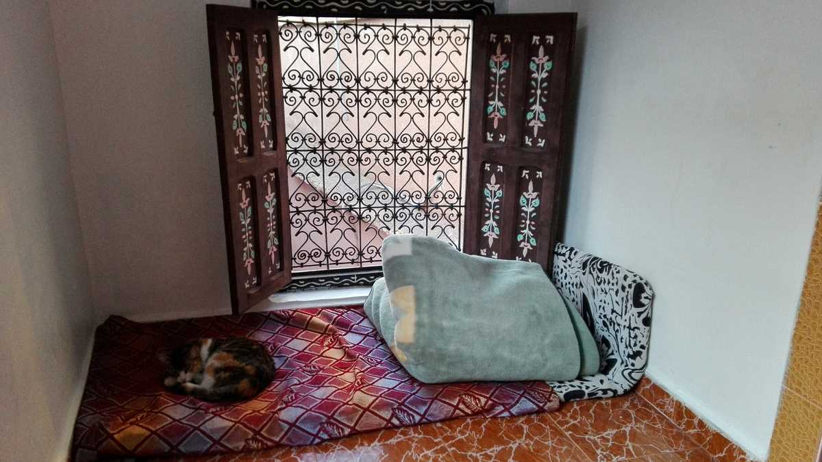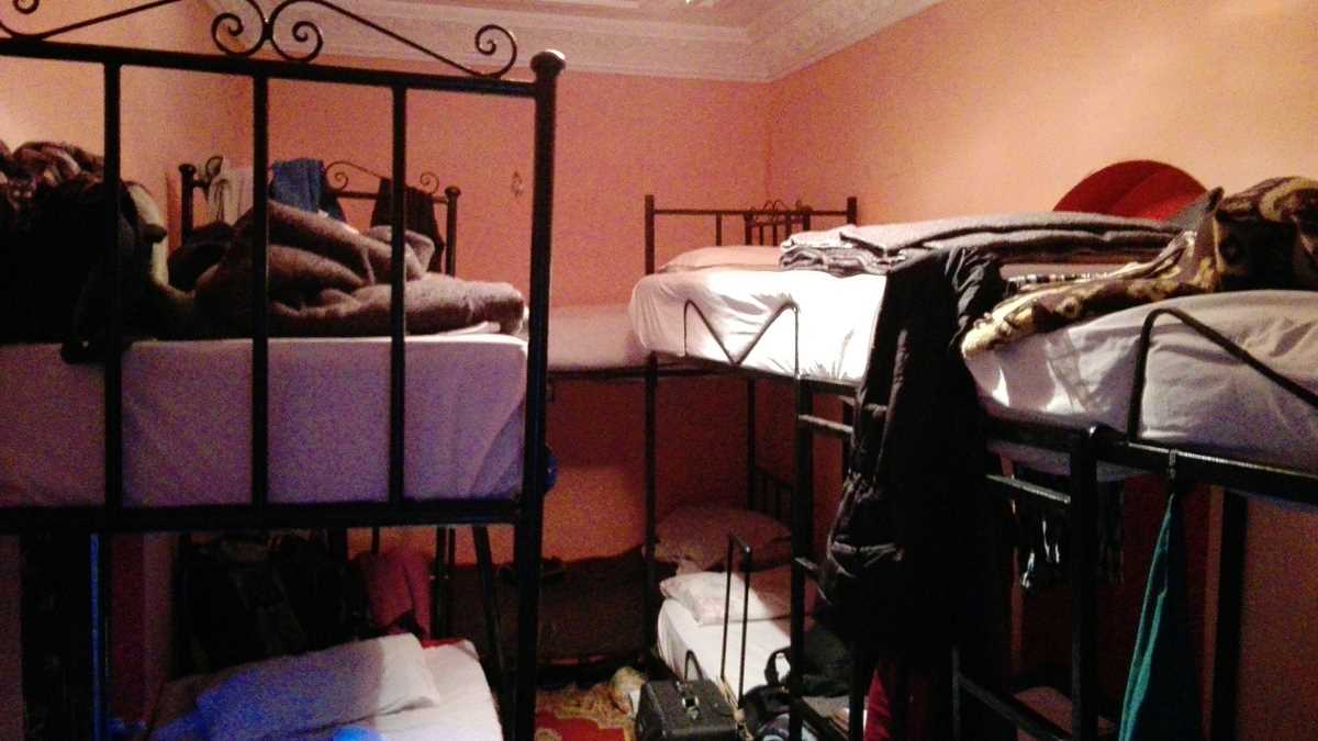 Locul: Cazarea pînă la decolare o găsisem tot în medina acestui oraș misterios, plin de contraste și mirosuri neașteptate. Online a fost simplu, mai dificil a mers cu găsirea hostel-ului pe teren, în labirintul de străduțe furnicar de oameni al medinei. Cum-necum, într-un tîrziu, am nimerit gangul lung unde, spre capăt, pe dreapta, se află ușa din zidul netencuit pe care scrie cu vopsea albă Kammy Hostel. Înăuntru, surpriză (plăcută): mi-a deschis o blondă drăguță, posesoarea unei engleze perfecte și a unei perechi de sîni spectaculoși, care m-a poftit pe canapeaua din spațiul comun cu ambianță total diferită de haosul de-afară. Și, mai apoi, la etaj, spre camera umplută cu paturi în care aveam să dorm jumătate de noapte. Supremul lux al locașului meu de la parterul unuia dintre cele patru bunk-bed-uri printre care abia aveai loc să te strecori era reprezentat de firida din zid pe care se pot depozita lucruri și cearșaful cel mai aproape de noțiunea de curat pe care l-am găsit într-un hostel marocan.