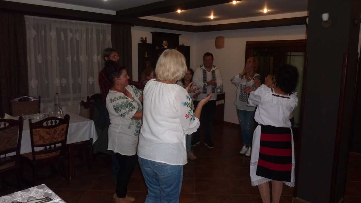 Ambianța: …cina prelungită cu dans pînă dincolo de miezul nopții, începută oficial după poza de ansamblu folcloric cu toată lumea în ie (pînă s-o îmbrac pe cea cumpărată a doua zi la Voroneț, am împrumutat una de la Cristi, care venise pregătit în bagaje cu trei bucăți! – deh, statutul de redactor-șef la revista Vacanțe la țară obligă…). Peisajul sonor nu putea fi diferit de specificul excursiei: s-a dansat și s-a cîntat pe muzică populară din toate zonele natale ale participanților, din Moldova în Dobrogea și din Mizil în Sălăjan, cu un ocol scurt prin Goran Bregovic sau Phoenix. O petrecere la care last people dancing am fost cinci oameni hotărîți (Lavinia, Cristina, Ileana și doamna Dina din Dumitra, pe care o luaserăm cu noi că prea ne primise frumos, acasă la dînsa, la Năsăud). După cum merg treburile cu pandemia, cred că, fără să știm, pe 10-11 octombrie, sărbătoream deja revelionul.