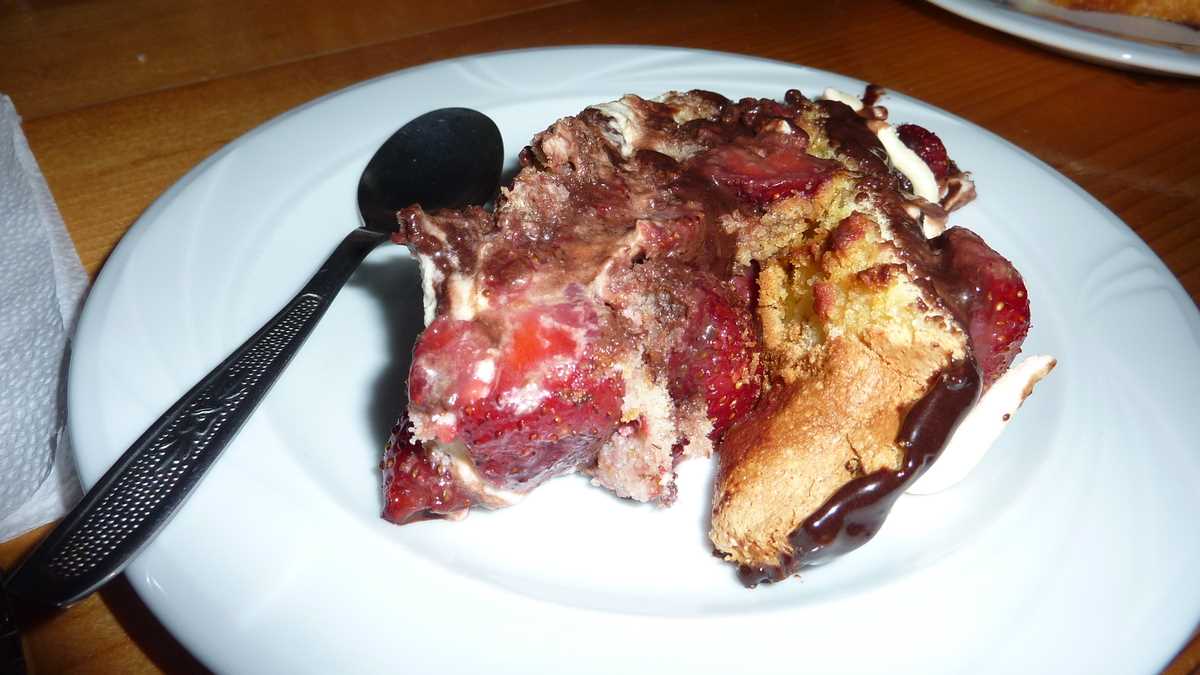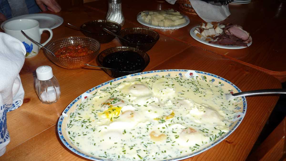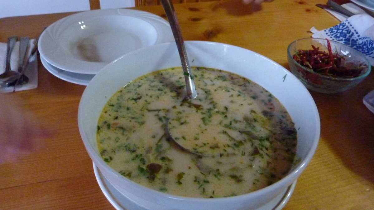 Ambianța: …am fost musafirul pensiunii pe perioada deschiderii Centrului de vizitare al Parcului Național Călimani din Șaru Dornei, împreună cu alți colocatari temporari, colegi din presă sau activiști ecologiști, printre care și doi invitați din Germania. După ce am gustat mîncarea pensiunii, am căzut cu toții de acord că merită să vii în Bucovina și doar ca turist gastronomic: la masă, am fost răsfățați de doamna Hunea ca la mama acasă (dacă mama ar fi locuit în Bucovina). Afinată, pîine de casă, răcituri de pasăre, ied la cuptor, zacuscă de ghebe, tarte cu fructe de pădure. Toate astea și multe altele, asortate invariabil cu o smîntînă groasă, de stă lingura drepți în cană – marcă culinară bucovineană, cred (dacă încă nu e, ar trebui înregistrată la OSIM), pe care n-am mai avut ficat să le testez: la micul dejun, ochiuri în smîntînă; la prînz, borș dres cu smîntînă, păstrăv cu smîntînă și hribi cu smîntînă; la cină, brînză cu smîntînă și papanași cu smîntînă. La plecare, nu m-aș fi mirat dacă am fi primit hrană rece pentru drum niște sandvișuri cu smîntînă.