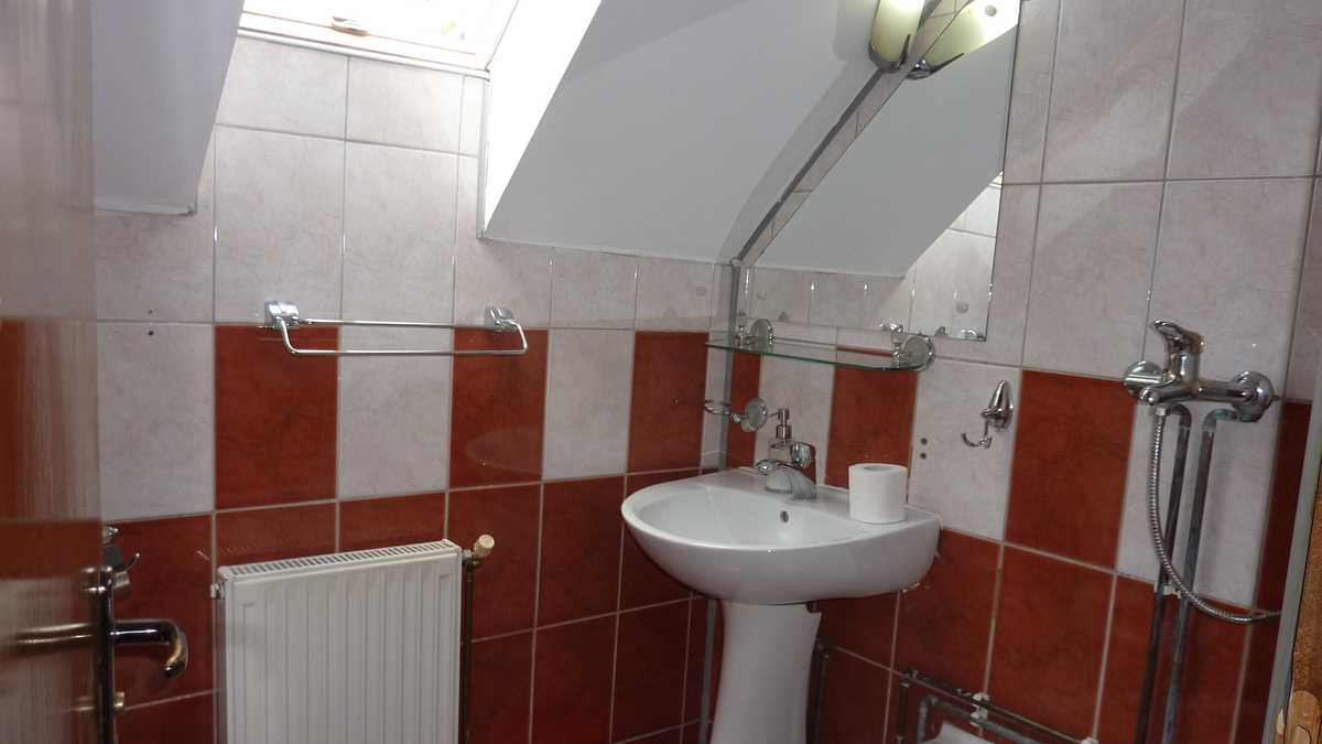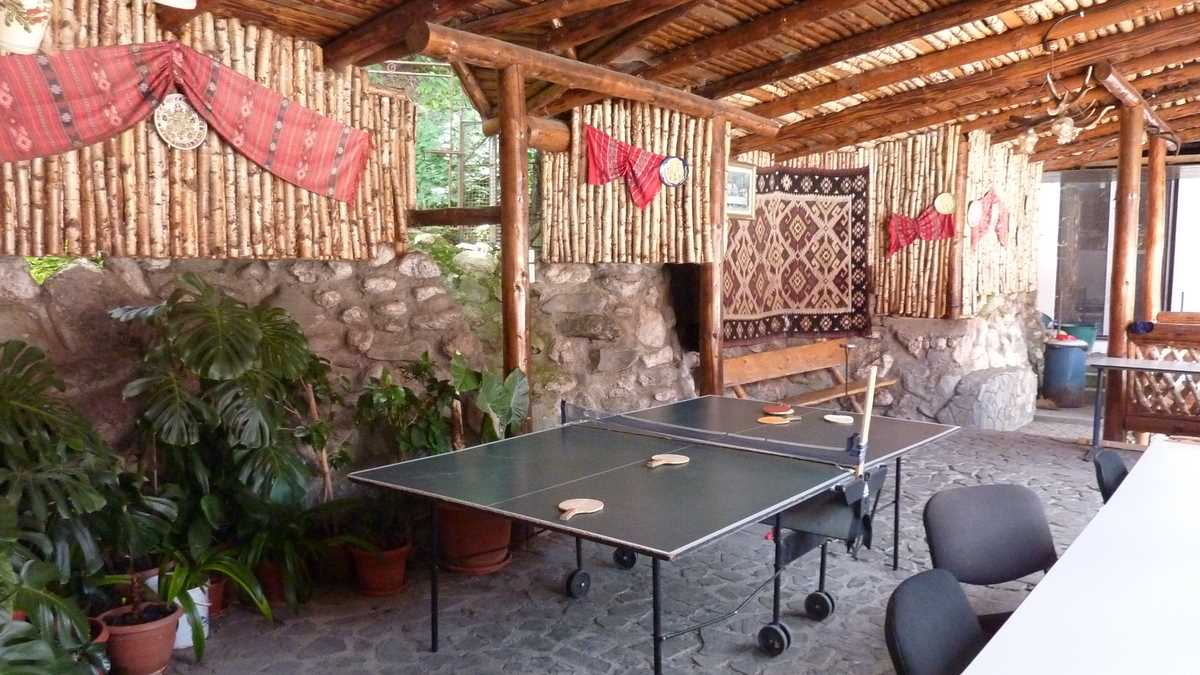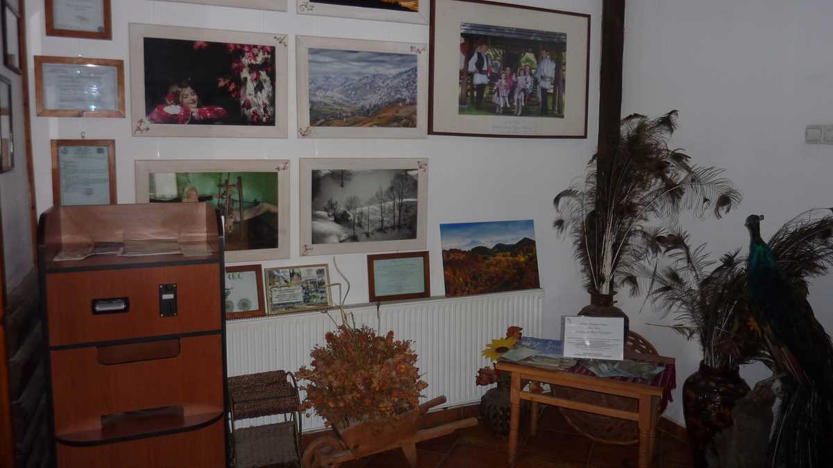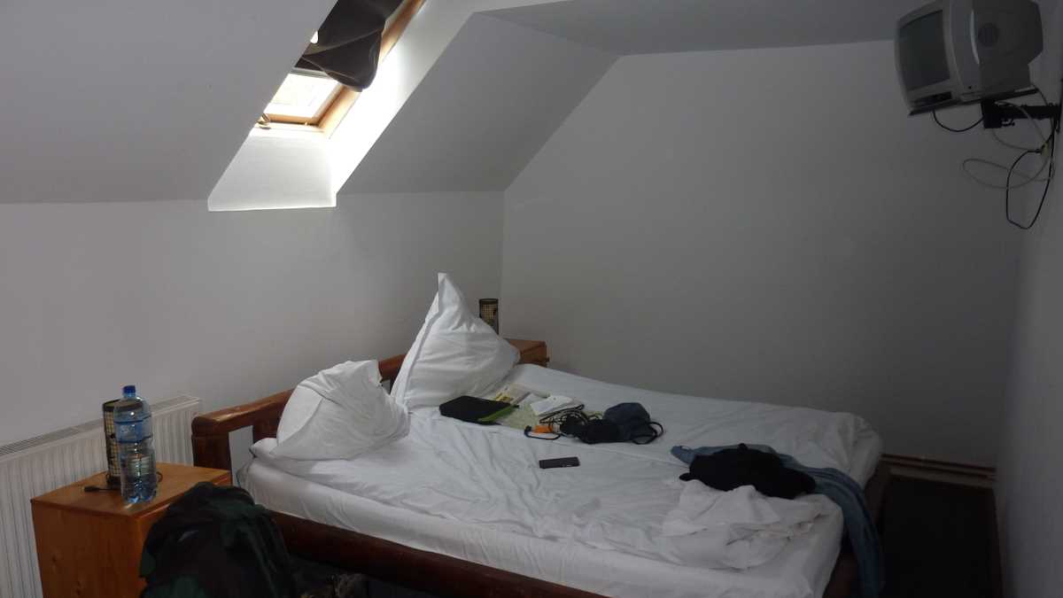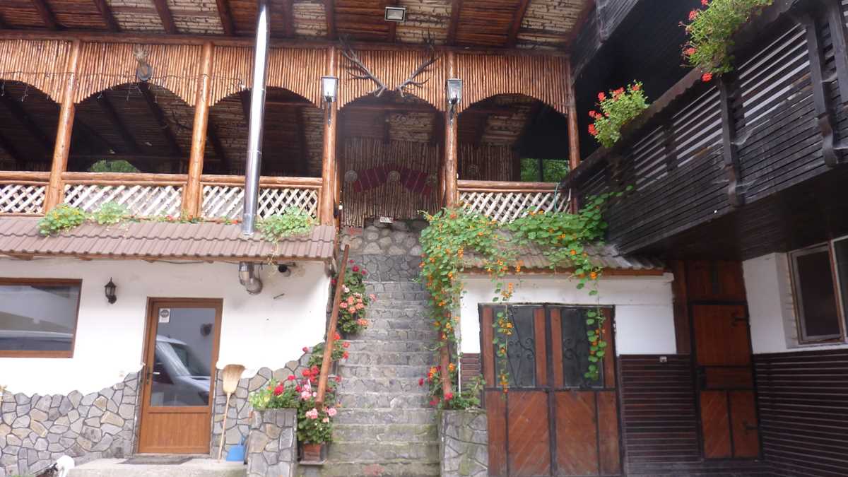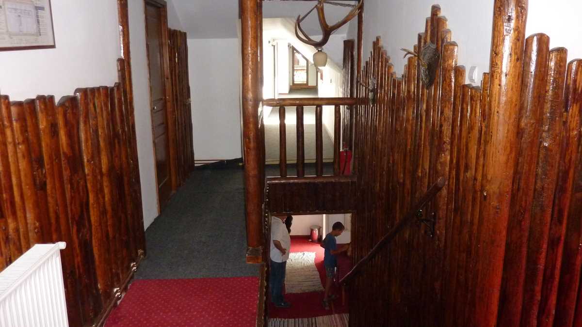 Dotările: …și, pe ușa clădirii stil cabană, în holul cu pozele zonei pe pereți care duce în sala de mese de la etaj, unde, pe lîngă alte mîncăruri locale, se servesc și celebrii cozonaci vînduți de chioșcul de la intrarea la Castelul Bran. După ce-ai primit cheia, ai voie să urci treptele din lemn masiv spre dubla cu numărul 7 de la mansardă în care lași ostenit rucsacul lîngă pat și intri în baia alăturată, ca să te speli puțin pe ochi privind pe geam peisajul: grădina înverzită, locul de joacă, terenul de sport, foișoarele, muntele.