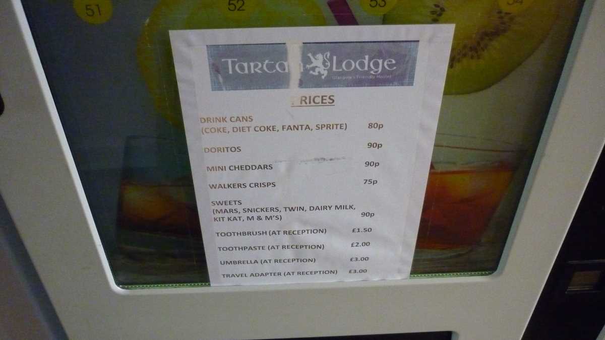 Prețurile: Camera 110 din turn repartizată de majordomul modern care m-a așteptat după ușă, în recepție, m-a costat 10 lire. Adică patul 7, un etaj de bunk-bed, unul dintre cele opt locuri la condiții de hotel de două stele, cu baie în cameră, locker sub pat, două prize și raft pentru depozitat diverse lîngă pernă. Alți bani ți-ar mai trebui, eventual, în sala de mese cu televizor LED de diagonală mare pus non-stop pe știri, la cele două automate. Unul pentru nevoi fiziologice (apă – 50 pence, doză de Cola – 80 p, baton de Snickers – 90 p), altul pentru cele neurologice (slot machine).