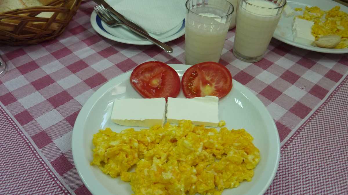 Prețuri: Ca să apuci să faci turul ăsta de cameră trebuie mai întîi să lași jos la recepție un ID și minimum 1.300 de dinari de persoană pentru regim B&B, plus 10 dinari asigurare și 50 de dinari taxă de oraș (în total, cam 11 euro/noapte). Micul dejun se servește în sala de mese de la subsol, în patru variante fixe. Farfuria mea a venit cu varianta 1: omletă, două felii de brînză, o roșie tăiată în două și un pahar cu iaurt. De remarcat că foaia-meniu are traducere și în românește. (Să fi încercat la pasul 1, check-in-ul, rostirea directă a propoziției în loc de mimă?)